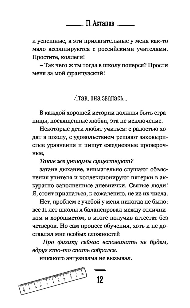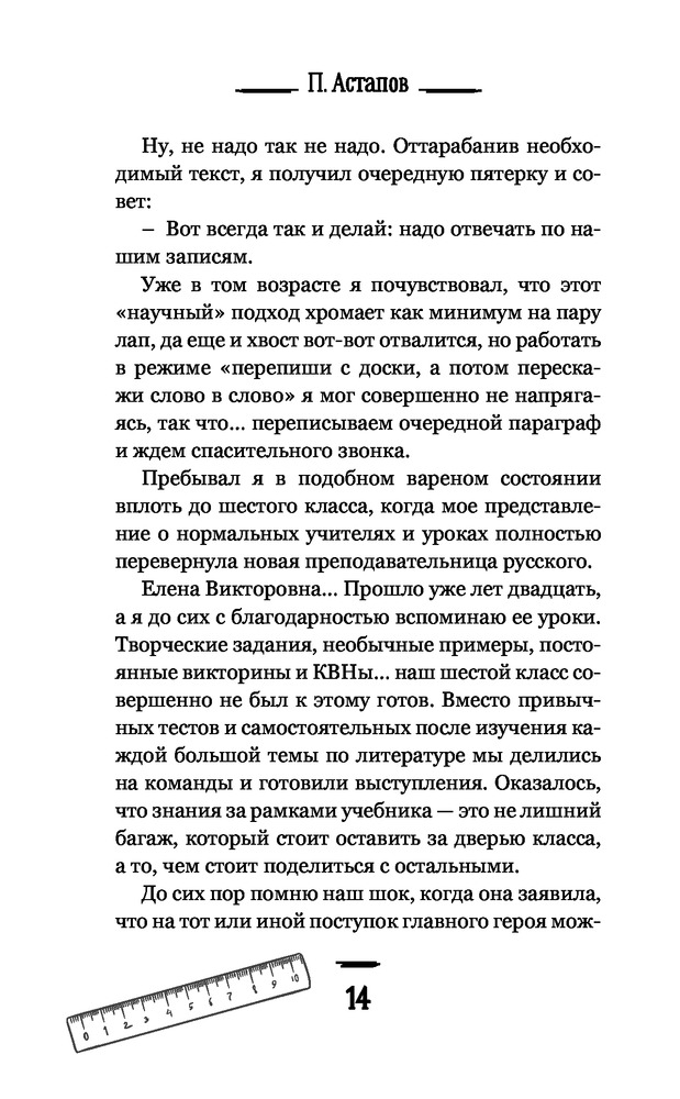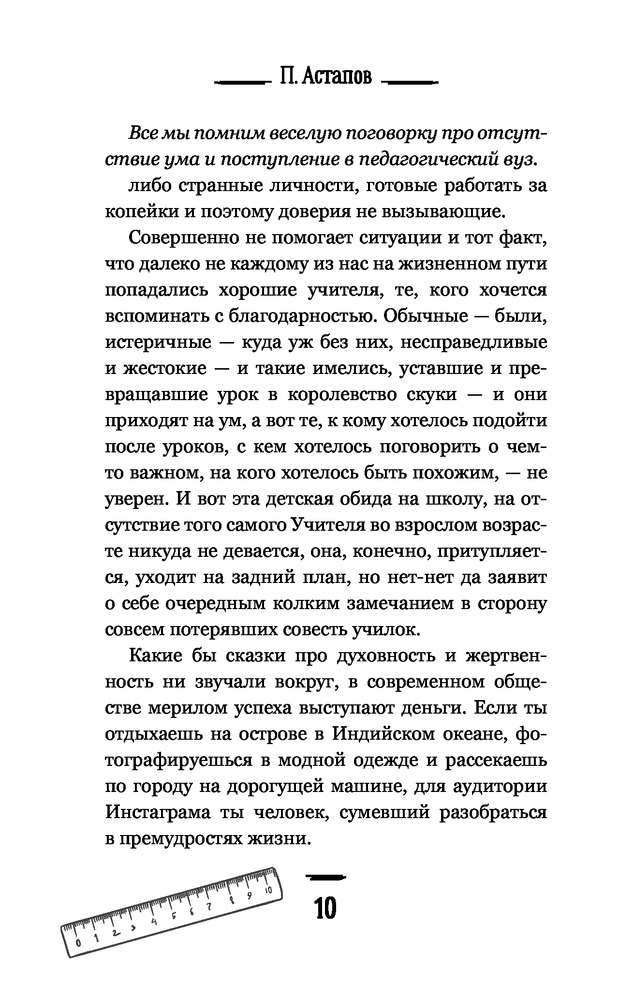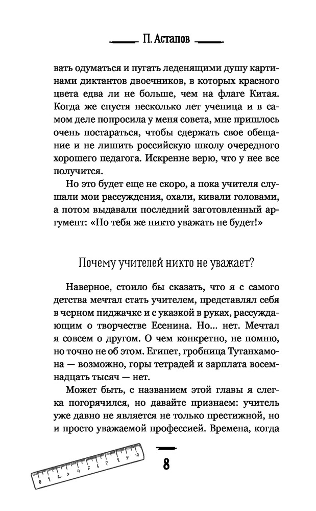 Как человек, работающий в сфере образования могу сказать: книга интересная. Автор описывает ежедневные ситуации и проблемы с которыми сталкиваются педагоги. Описание идет в позитивной и поучительной форме. Рекомендую книгу почитать молодым педагогам которые пришли работать в школу. После книги остается приятное чувство, на протяжении чтения книги- создается ощущение что всё это время разговариваешь с человеком по душам как педагог с педагогом и обсуждаешь одинаковые проблемы.