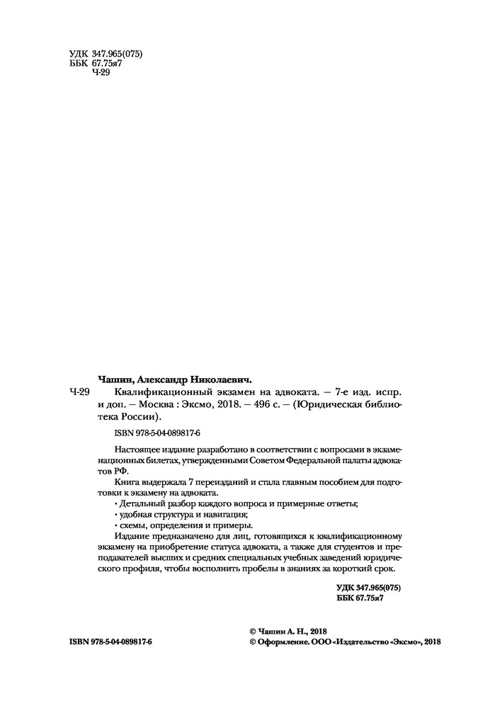 Квалификационный экзамен на адвокатаВ данный момент этот товар отсутствует в продаже. Возможно, у нас найдется аналогичный или похожий товар здесь. Серия: Юридическая библиотека России Настоящее издание разработано в соответствии с вопросами в экзаменационных билетах, утвержденными Советом Федеральной палаты адвокатов РФ. Книга выдержала 7 переизданий и стала главным пособием для подготовки к экзамену на адвоката. Детальный разбор каждого вопроса и примерные ответы, удобная структура и навигация, схемы, определения и примеры. Издание предназначено для лиц, готовящихся к квалификационному экзамену на приобретение статуса адвоката, а также для студентов и преподавателей высших и средних специальных учебных заведений юридического профиля, чтобы восполнить пробелы в знаниях за короткий срок. |