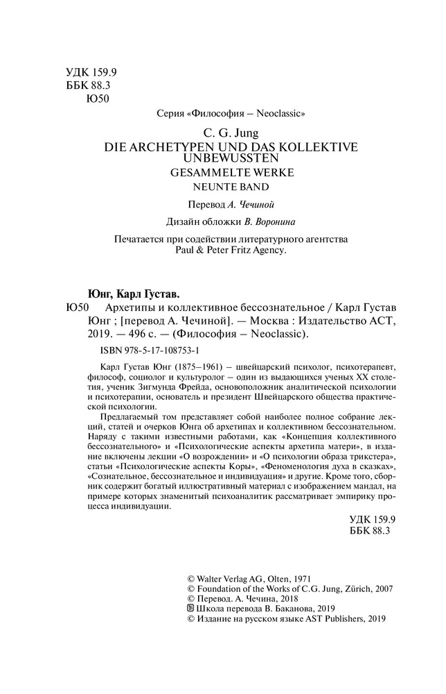 Архетипы и коллективное бессознательноеВ данный момент этот товар отсутствует в продаже. Возможно, у нас найдется аналогичный или похожий товар здесь. Серия: Философия – Neoclassic Карл Густав Юнг (1875–1961) — швейцарский психолог, психотерапевт, философ, социолог и культуролог — один из выдающихся ученых ХХ столетия, ученик Зигмунда Фрейда, основоположник аналитической психологии и психотерапии, основатель и президент Швейцарского общества практической психологии. Предлагаемый том представляет собой наиболее полное собрание лекций, статей и очерков Юнга об архетипах и коллективном бессознательном. Наряду с такими известными работами, как «Концепция коллективного бессознательного» и «Психологические аспекты архетипа матери», в издание включены лекции «О возрождении» и «О психологии образа трикстера», статьи «Психологические аспекты Коры», «Феноменология духа в сказках», «Сознательное, бессознательное и индивидуация» и другие. Кроме того, сборник содержит богатый иллюстративный материал с изображением мандал, на примере которых знаменитый психоаналитик рассматривает эмпирику процесса индивидуации. |