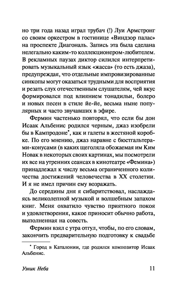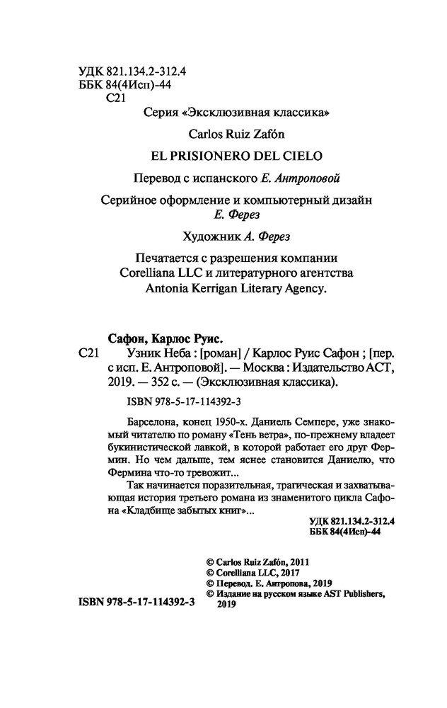 Книга является самой маленькой в цикле по объему. Но при этом даёт очень много информации о мире истории и о персонажах книги. Есть очень интересные повороты играющие свою роль в восприятии некоторых моментов из других книг цикла Автора, и собственно в этой самой. Уже прочитал весь цикл и буду дальше читать книги Автора. Теперь появилось исполинское желание в будущем поехать в Испанию в Барселону и посмотреть на этот, замечательно и загадочно описанный в книгах Сафона, город. В общем всем желаю возможность насладиться как минимум этой книгой, а если понравится то и остальными томами из цикла. Смотрю иногда видео про книги, но ещё ни разу не встречал что бы кто-нибудь отзывался об этом Авторе. Как будто все проходят мимо и не замечают такого талантливого писателя, что буквально повергает в недоумение. В этой книге я с удовольствием оставлю частицу своей души))).