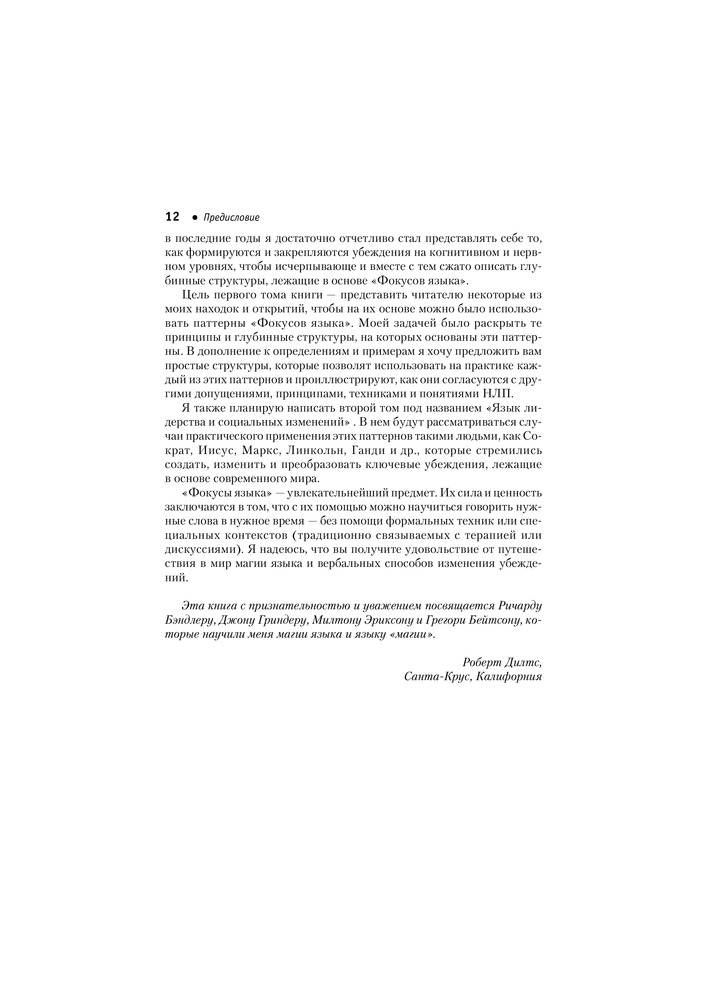 Помимо ключевых приложений НЛП в таких областях, как образование, творчество, здоровье и лидерство, личным вкладом Роберта в НЛП являются разработанные им технологии изменения стратегий мышления и системы убеждений, а также развитие такой области...