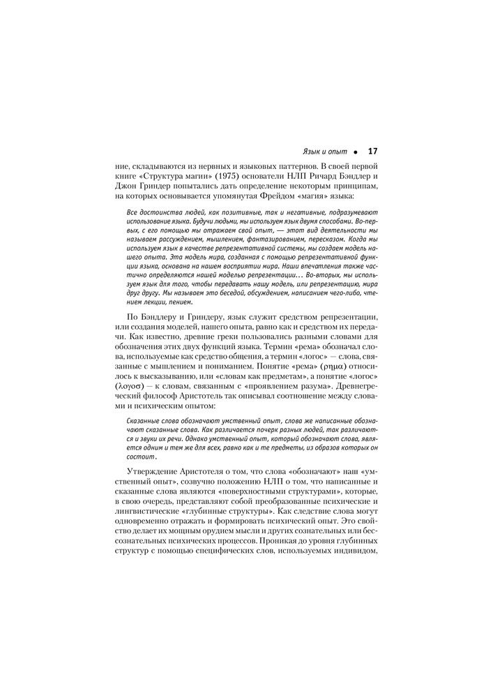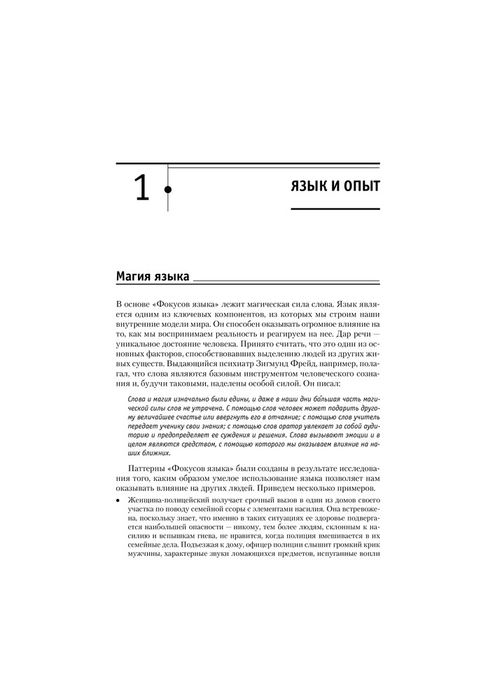Смысл в том, что определенные речевые шаблоны (паттерны) способны преобразовывать убеждения и восприятие какой-либо ситуации, кардинально изменяя наши реакции на нее. За три десятилетия, прошедшие с момента их открытия, «фокусы языка» заслужили право называться самым эффективным методом влияния и лучшим средством изменения убеждений в процессе общения.
