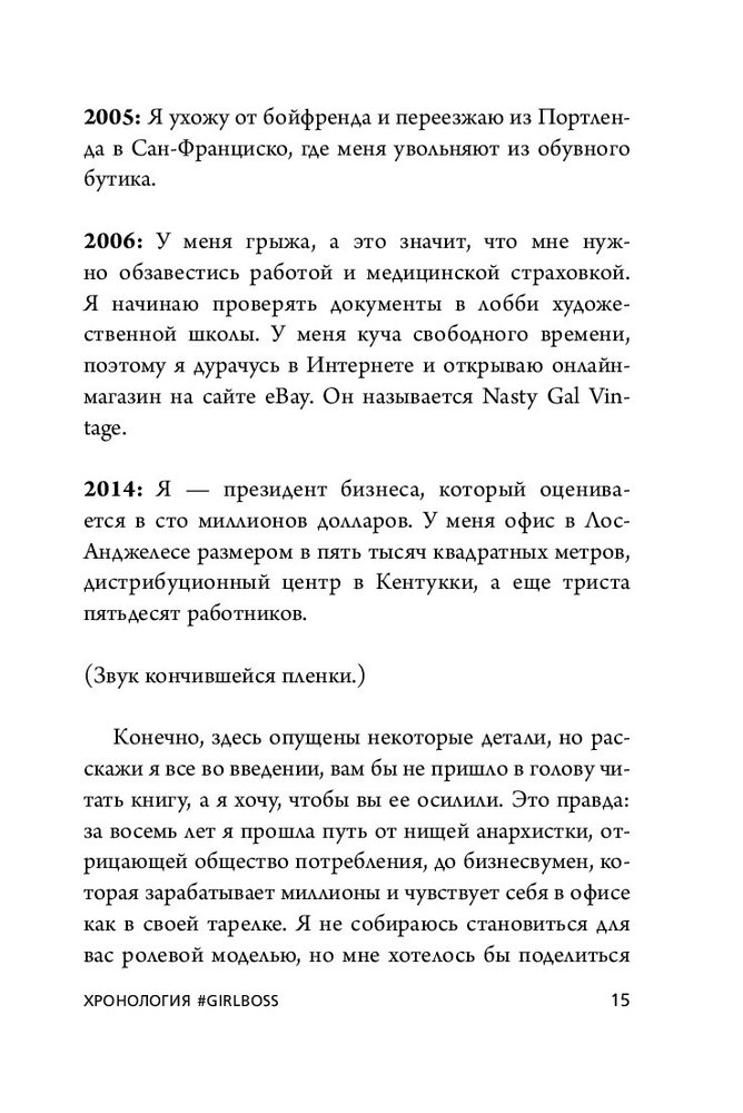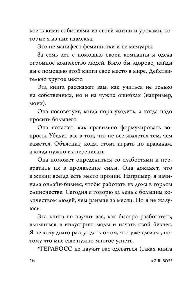Всем привет! Доставка и качество печати на высшем уровне. Что касается содержания книги, София рассказывает о своём личном опыте при построении бизнеса. Но в целом философия и основа книга остаётся той же, как и в остальных мотивационных книгах. 1. Надо заниматься тем, что ты любишь. Быть всегда в процессе работы над собой и быть занятой. 2. Не терять надежду и не сдаваться. 3. Уметь слушать, слышать и отбрасывать не нужное (фильтр). 4. Быть аутентичной , уникальной. Кстати, это актуально для наших девушек. 5. Принимать себя такой , какая ты есть и идти вперёд постоянно. 6. Не бояться ошибок и уметь рисковать. В целом лёгкая книга, хорошая. Но для человека , кто уже перечитал кучу книг по психологии и т.д. ничего нового не будет. Конечно, если сравнить с книгами про Google и NIKE is too easy.