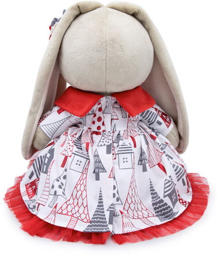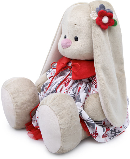Зайка в интересном платье с необычным принтом. Платье сшито с объёмным алым воротником из мягкого софта и нижней юбочкой из сеточки ярко-красного цвета. Спереди платье украшает бантик из красной бархатной ленты. На ушке у Зайки аксессуар ручной работы – два цветочка с листиком, выполненные в технике фелтинг. Зайки Ми — изобретение российских дизайнеров, в которое влюбляешься с первого взгляда. Плюшевые милашки прекрасны до мельчайших деталей.