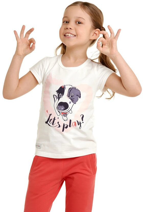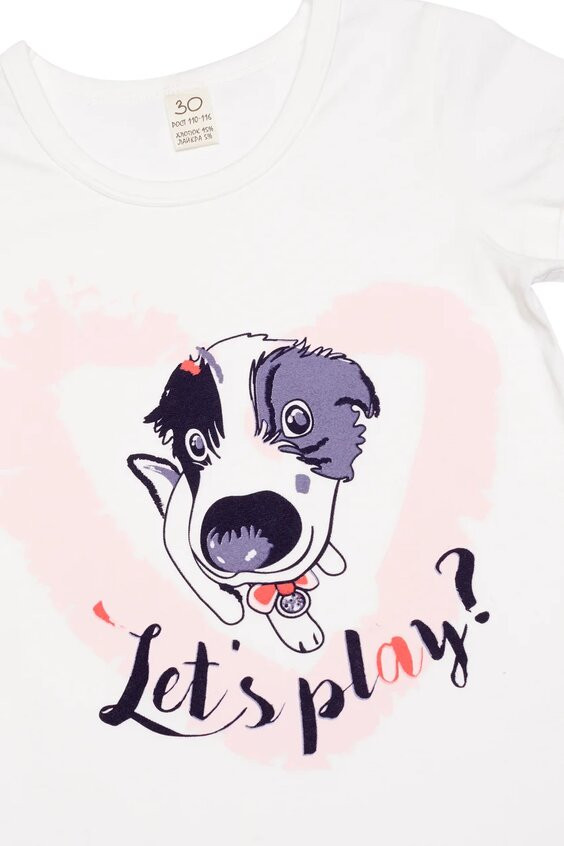Футболочка очень мягкая и нежная на ощупь и к телу. Соответствует размерной сетке. Так моей принцессе нравятся собачки эта футболочка с оригинальным принтом её самая любимая. Так же на более прохладную погоду у нас есть спортивный костюм из этой же коллекции (с длинным рукавом). После многократных стирок принт остался без изменения, не деформировалась