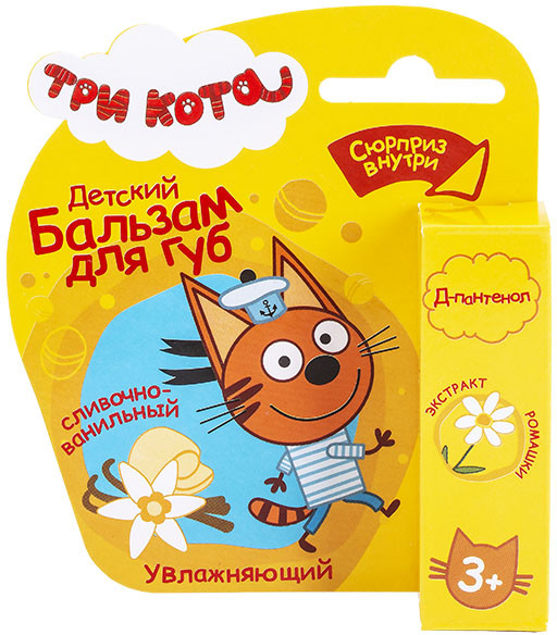 Галант Косметик Бальзам для губ детский «Сливочно-ванильный» с экстрактом ромашкиВ данный момент этот товар отсутствует в продаже. Возможно, у нас найдется аналогичный или похожий товар здесь. Серия: Три кота Перед вами детский бальзам для губ, на упаковке которого изображен кот Коржик из мультсериала «Три кота». |