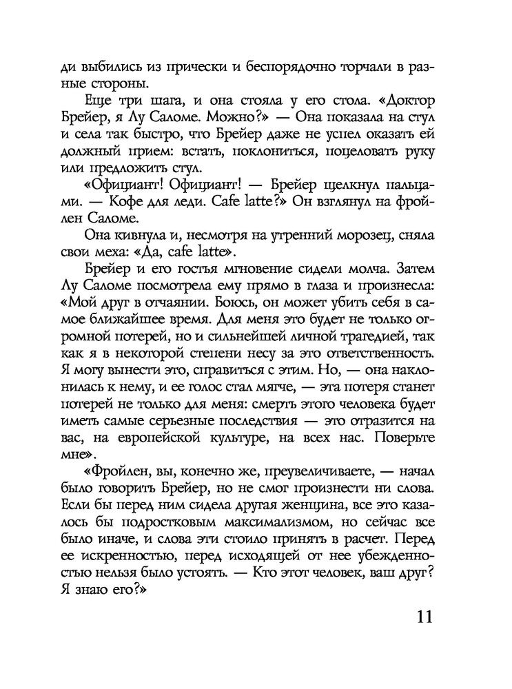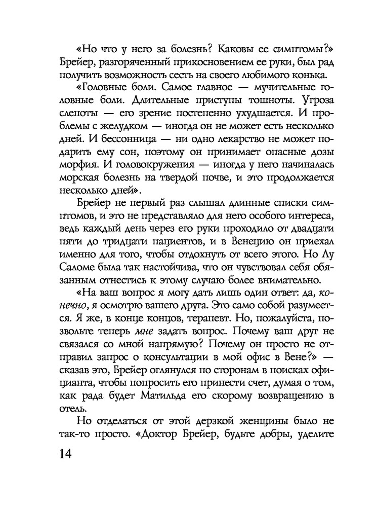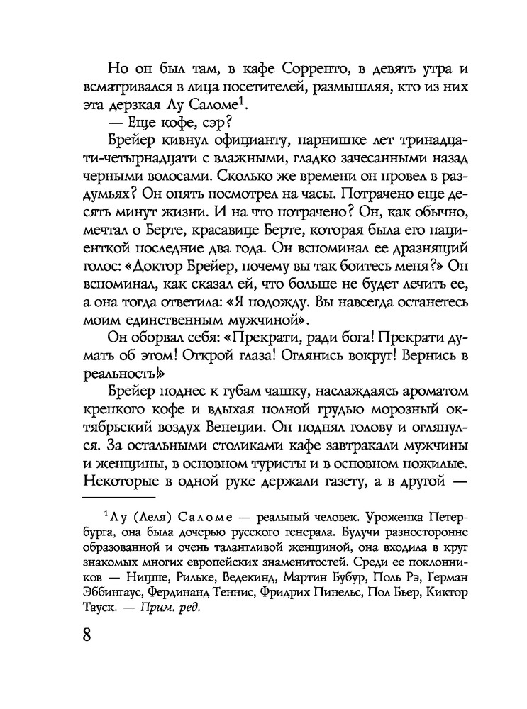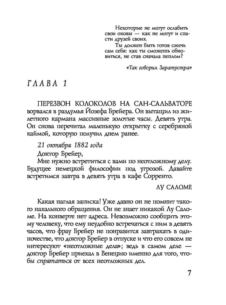 Ялом втягивает в действие не только Ницше и Брейера, но и Лу Саломе, "Анну О." и молодого медика-интерна Зигмунда Фрейда. |