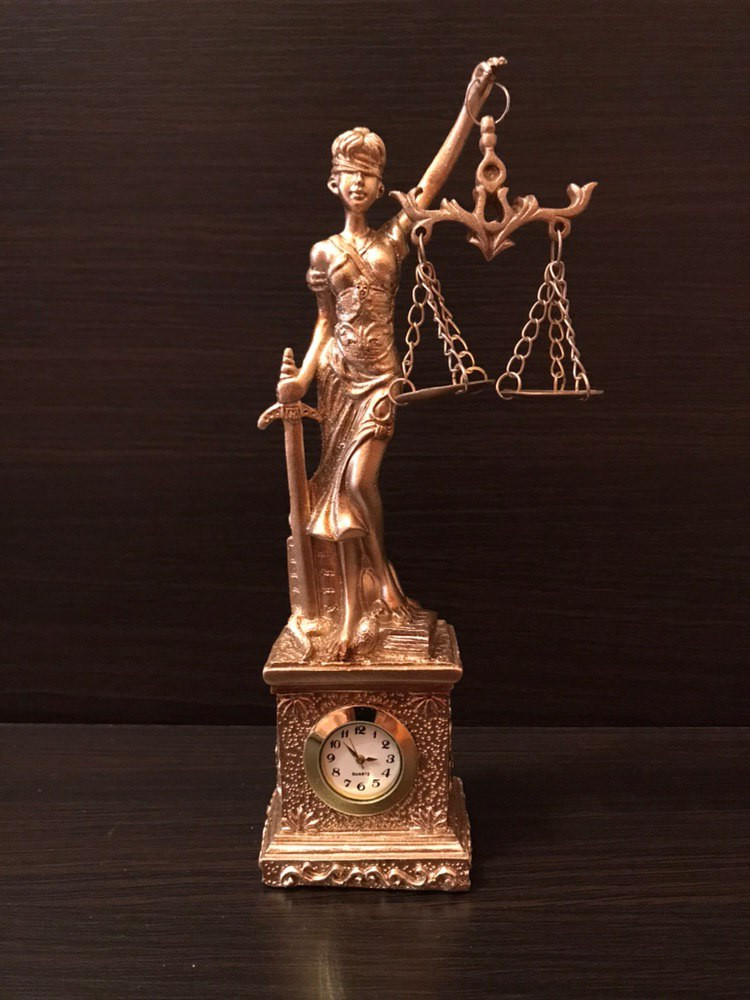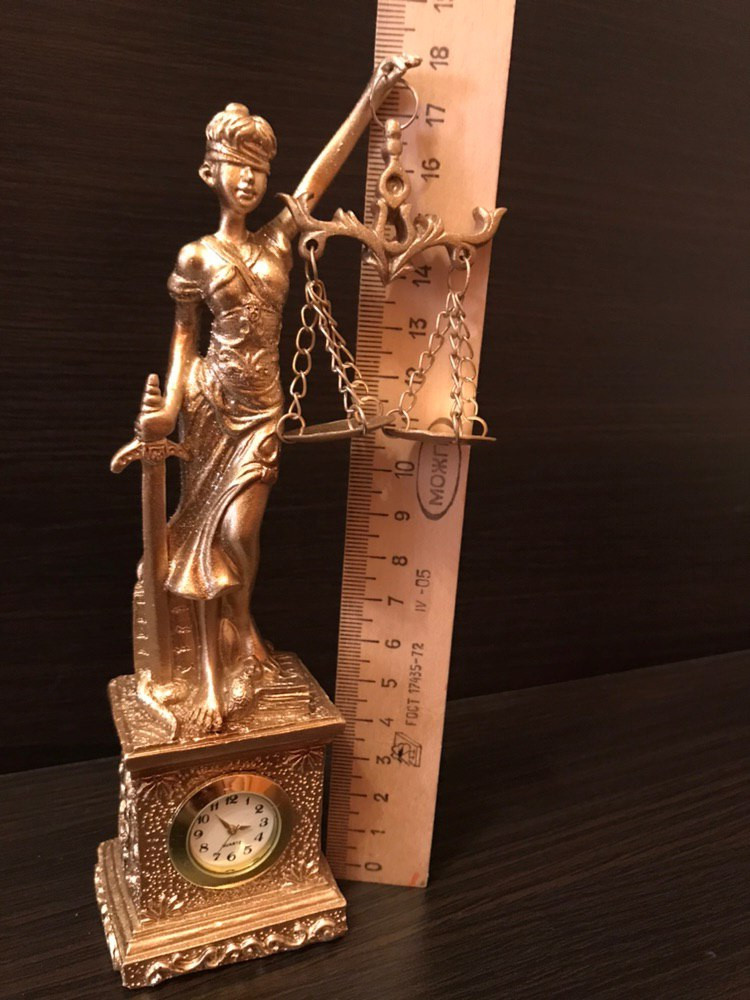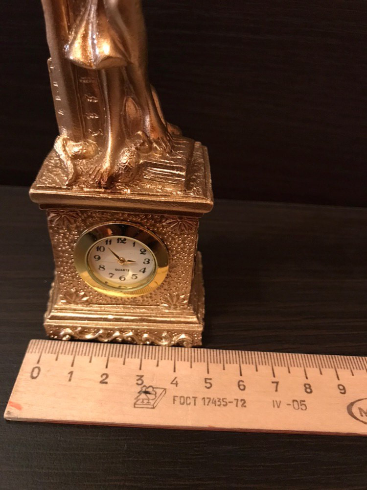 Богиня Фемида. Часы. Эстетика и практичность. Аккуратное и качественное изделие. Часы исправно работают. Статуэтка золотого цвета. Блёстки слегка осыпаются. Лишнее можно стряхнуть. Высота: около 20 см Ширина: 5см. Доставили вовремя. Изделие упаковано отлично. Всем довольны. Без нареканий.