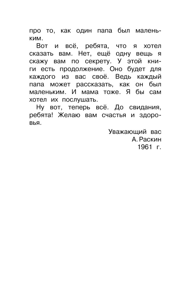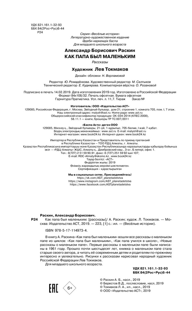 Как папа был маленькимВ данный момент этот товар отсутствует в продаже. Возможно, у нас найдется аналогичный или похожий товар здесь. Серия: Веселые истории В книгу сатирика А. Раскина «Как папа был маленьким» вошли все рассказы о маленьком папе из циклов: «Как папа был маленьким», «Как папа учился в школе», «Новые рассказы о маленьком папе». Первые рассказы о маленьком папе были написаны в 1961 году. Прошло почти шестьдесят лет, книжка о маленьком папе стала старше своего автора, а читать её современным детям и родителям по-прежнему интересно. Рисунки к рассказам нарисовал народный художник Российской Федерации Лев Токмаков. |