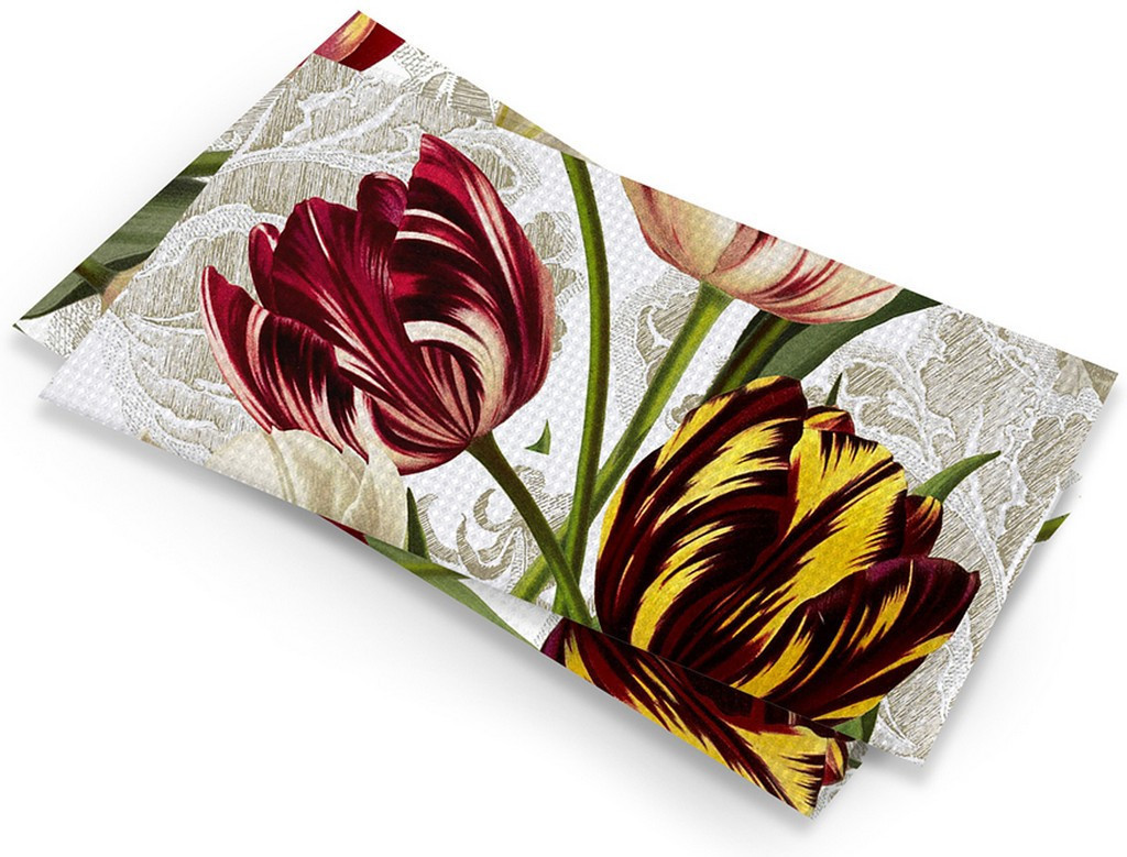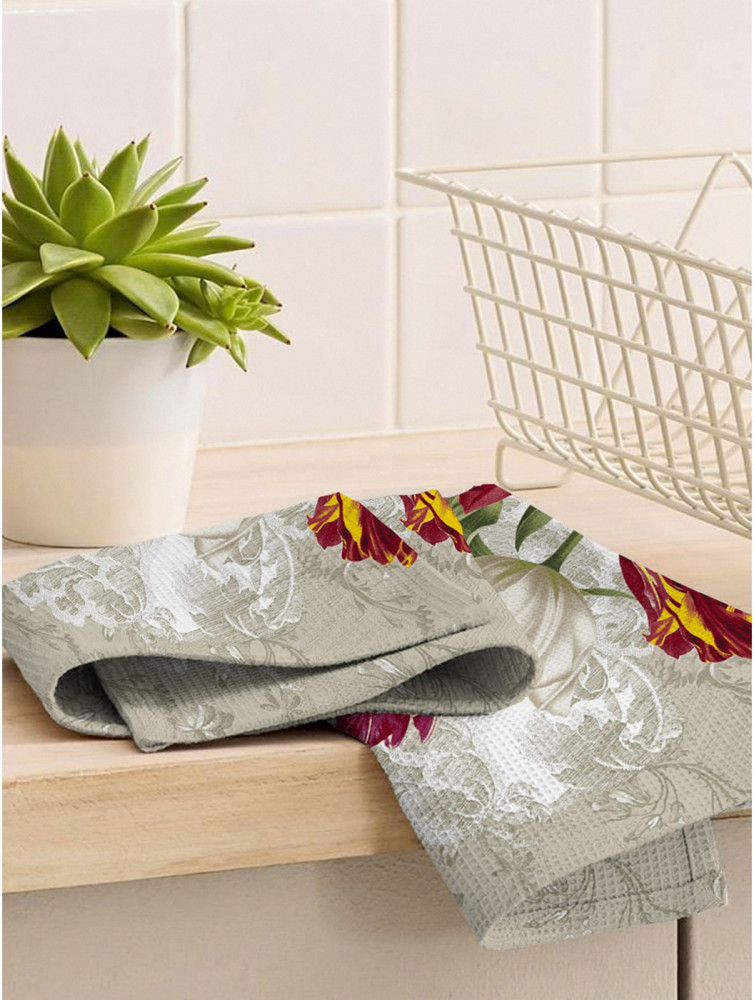Красивые полотенца хорошего качества, размер для кухни отличный. У меня есть скатерть и салфетки из серии "Шарлиз". Единственное, что на фото тюльпаны большие, как на скатерти, а на данных вафельных полотенцах мелкие. Это даже неплохо.