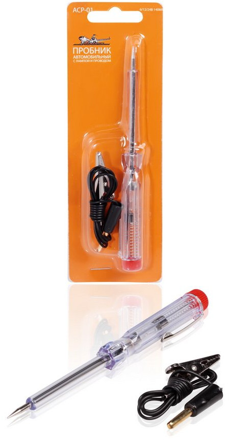 Пробник предназначен для поиска напряжения и проверке электрических цепей в электрической проводке автомобиля. В своей конструкции имеет встроенную лампу, которая светится при подаче напряжения на щупы пробника. Форма щупа сделана как острая, что позволяет прокалывать изоляцию на проводе (не нужно нарушать целостность проводки).