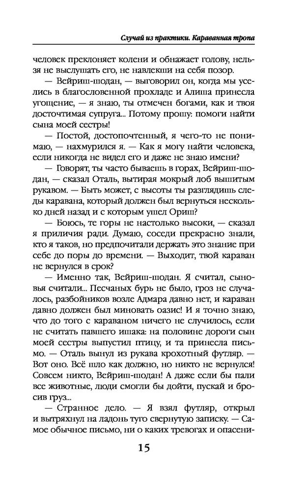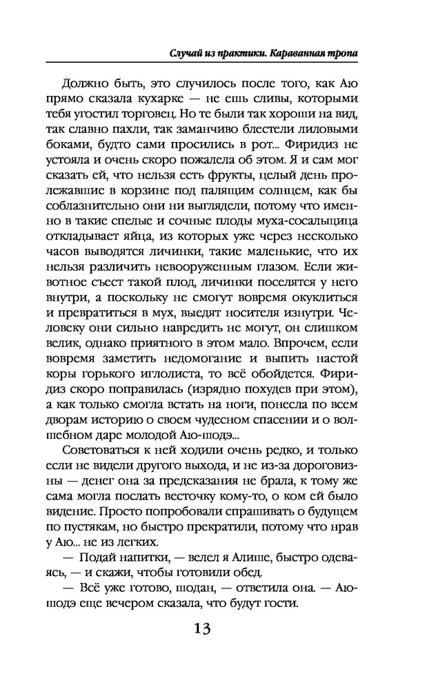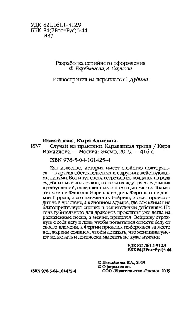 Случай из практики. Караванная тропаВ данный момент этот товар отсутствует в продаже. Возможно, у нас найдется аналогичный или похожий товар здесь. Серия: Колдовские миры Киры Измайловой Как известно, история имеет свойство повторяться — в других обстоятельствах и с другими действующими лицами. Вот и тут снова встретились колдунья из рода судебных магов и дракон, и снова их ждут расследования преступлений, совершенных с помощью магии. Только это уже не Флоссия Нарен, а ее дочь Фергия, и не дракон Гарреш, а его племянник Вейриш, и дело происходит не в Арастене, а в знойном Адмаре, где сам климат не благоприятствует спешке и решительным действиям. Но тень губительного для драконов проклятия уже легла на раскаленные пески, а значит, придется Вейришу стряхнуть с себя негу и лень, чтобы попытаться отвести беду от своего племени, а Фергии придется побороться за место под жарким солнцем, чтобы доказать, что женщины умеют колдовать и логически мыслить не хуже мужчин. |