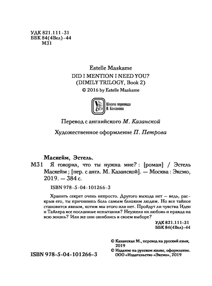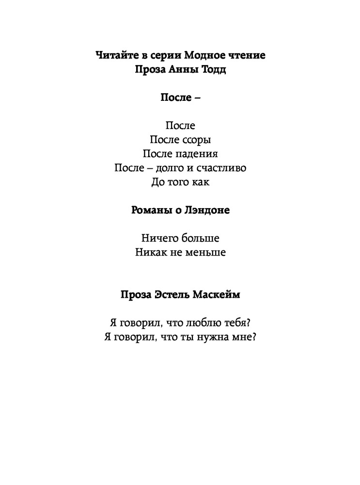 Я говорил, что ты нужна мне?В данный момент этот товар отсутствует в продаже. Возможно, у нас найдется аналогичный или похожий товар здесь. Серия: Модное чтение. Проза Анны Тодд и Эстель Маскейм (обложка) Хранить секрет очень непросто. Другого выхода нет — ведь, раскрыв его, ты причинишь боль самым близким людям. Но все тайное становится явным, хотим мы этого или нет. Пройдут ли чувства Иден и Тайлера все посланные испытания? Неужели их любовь и правда на всю жизнь? Или же они ошиблись в своем выборе? |