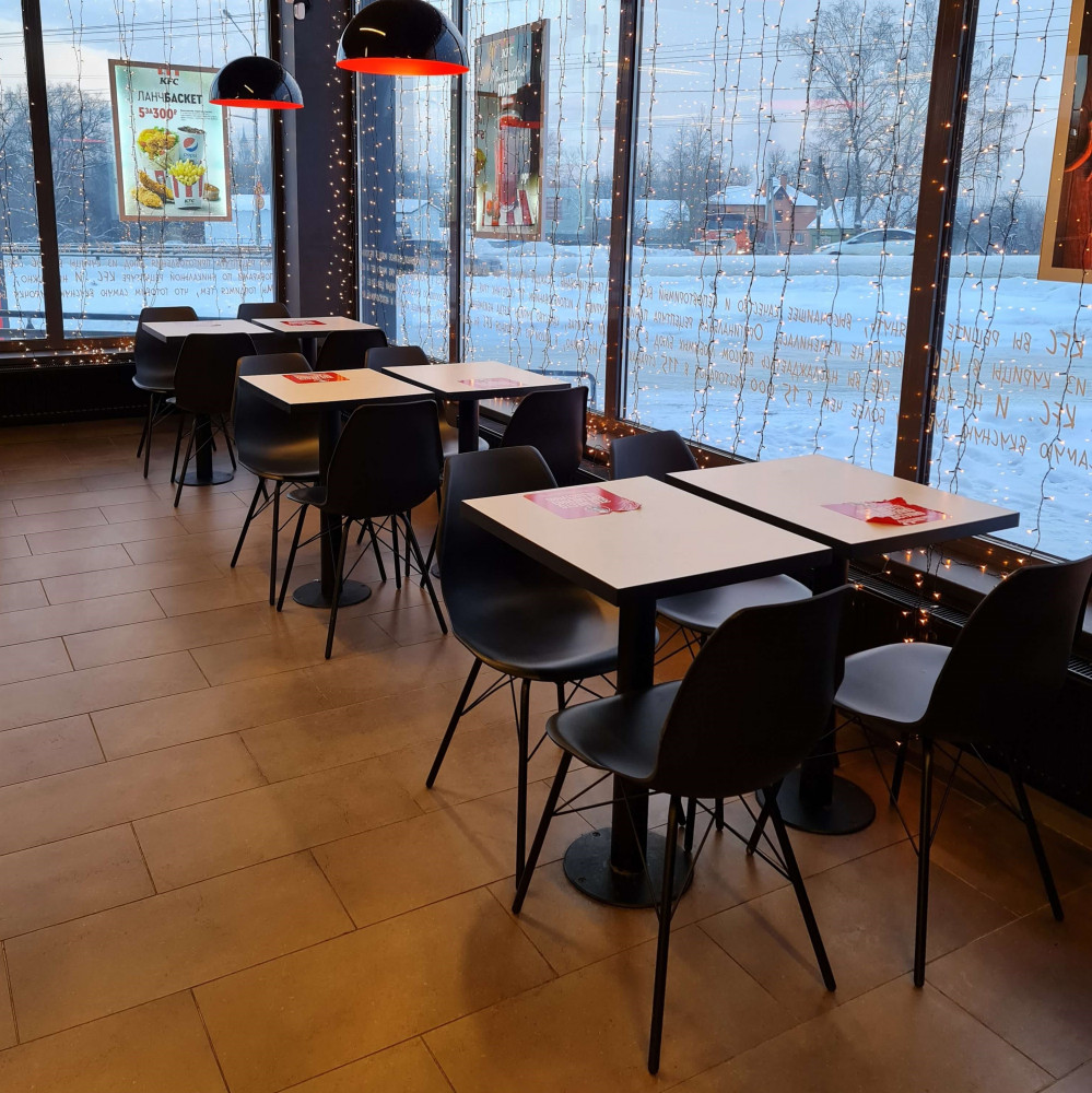 На кафеле скользит, для комфорта лучше сразу подушечки для стульев. Было доступно только 4 стула.