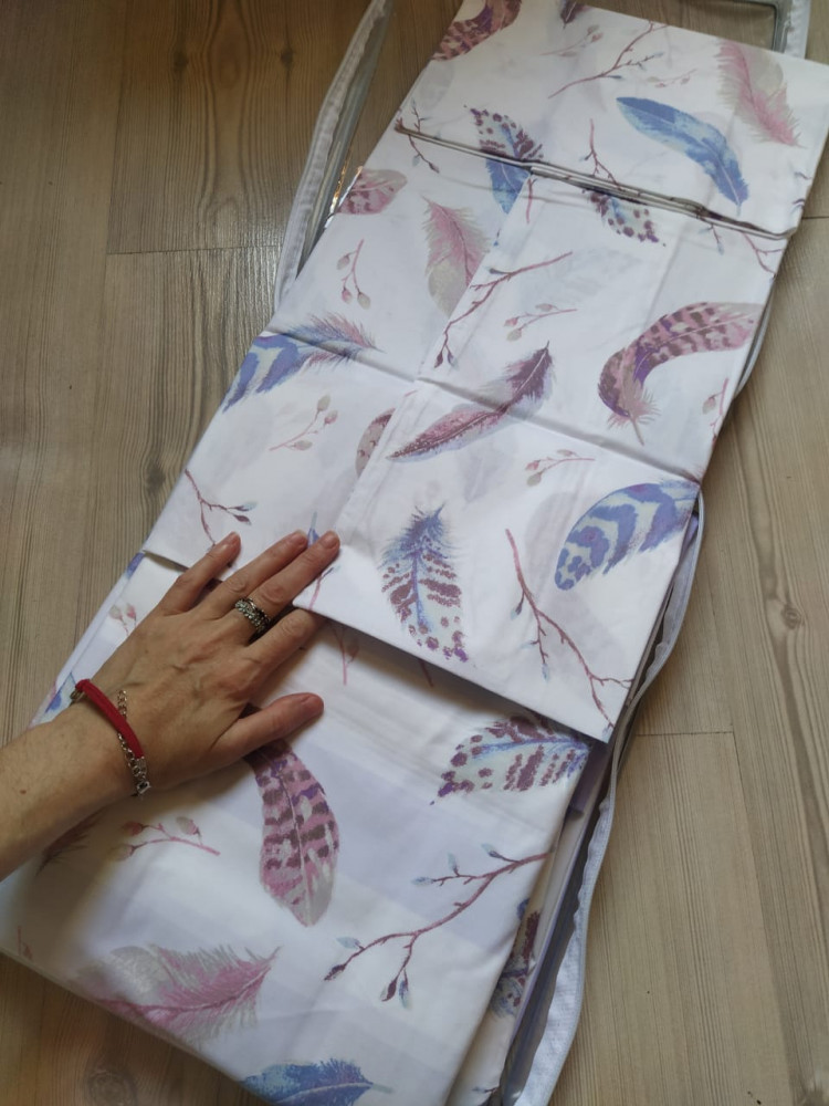 Упаковка обычная, для подарочных враиантов есть более красочные, в коробках. На ощупь ткань мягкая. Визуально были другие ожидания- на фото рисунок перьев как буд-то больше и качество печати другое... но это не то, что меняет свойства в эксплуатации. Если бы увидела в магазине, большой вопрос взяла бы... в такой ценовой категории уже есть с чем сравнить и выбрать.