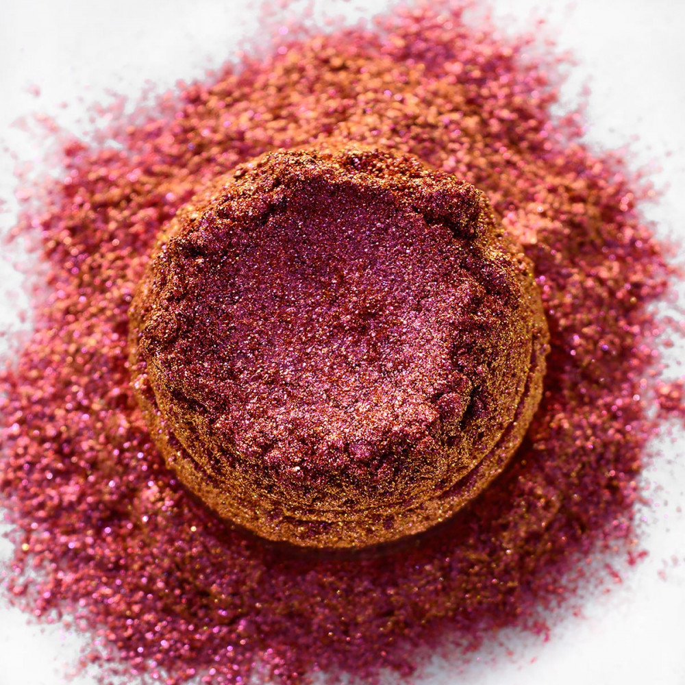 Брала тропический шторм, основной цвет рыжий, бледный, относительно крупные частицы слюды. При попадании прямого света - зеленые, под углом - голубые. Осыпаются, без основы будут блестки на всем лице.