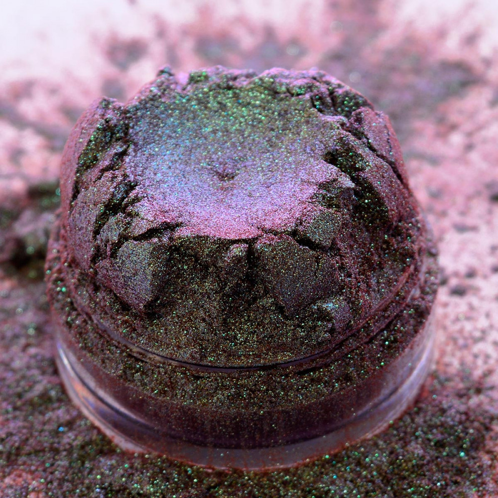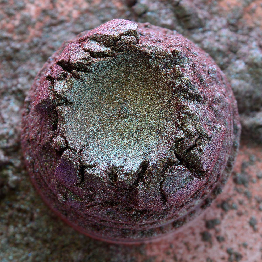 Брала тропический шторм, основной цвет рыжий, бледный, относительно крупные частицы слюды. При попадании прямого света - зеленые, под углом - голубые. Осыпаются, без основы будут блестки на всем лице.