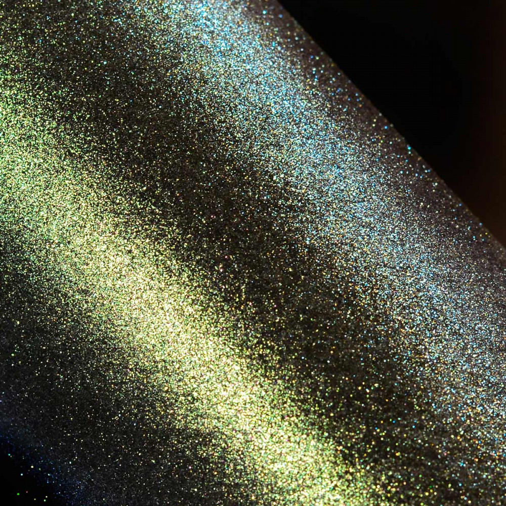 Брала тропический шторм, основной цвет рыжий, бледный, относительно крупные частицы слюды. При попадании прямого света - зеленые, под углом - голубые. Осыпаются, без основы будут блестки на всем лице.