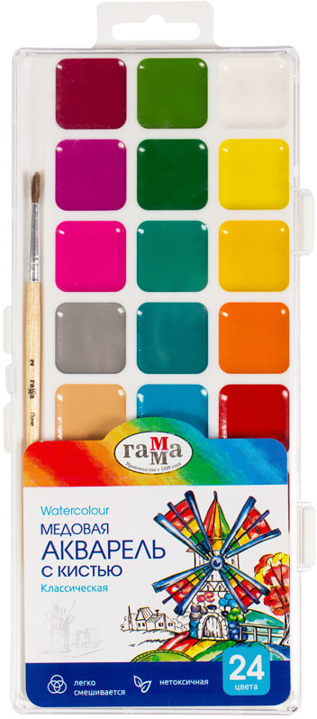 Краски акварельные Гамма «Классическая» для школы и творчества. Цвета классической серии — яркие, чистые и насыщенные. Как и другие продукты детских серий Гамма, «Классическая» акварель легко смывается с рук и отстирывается с одежды.