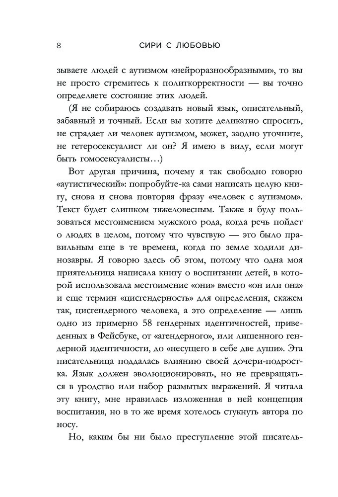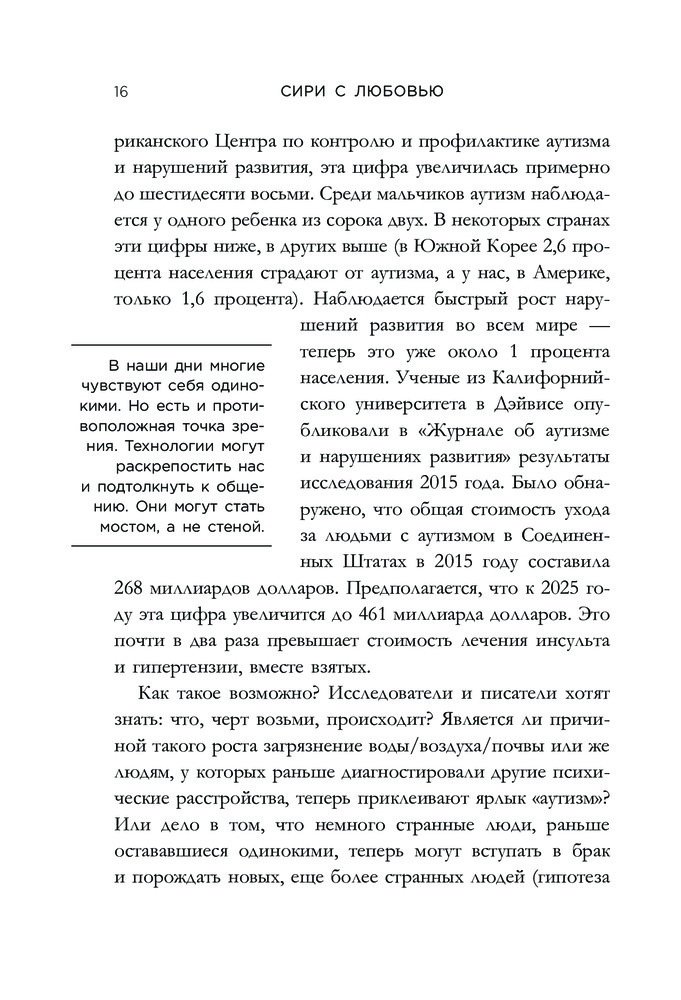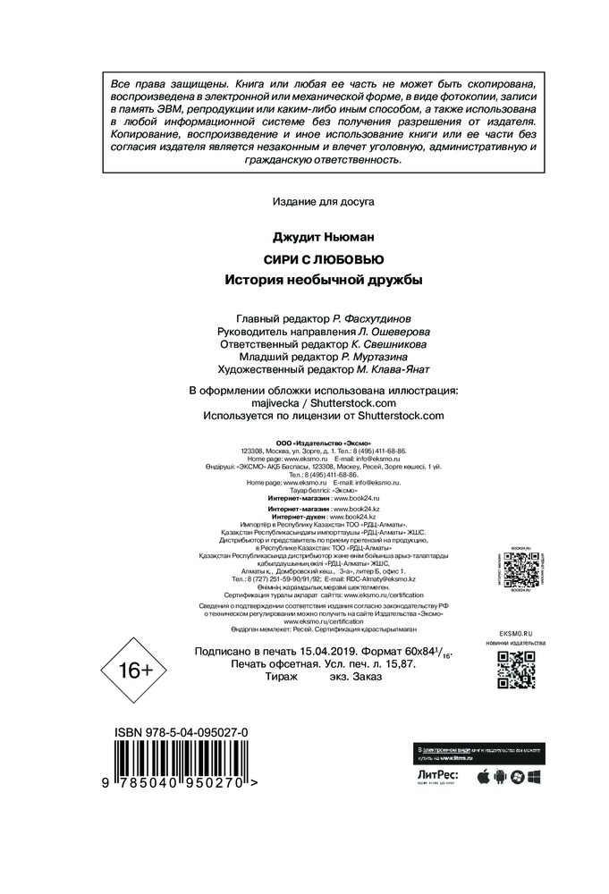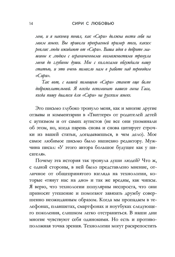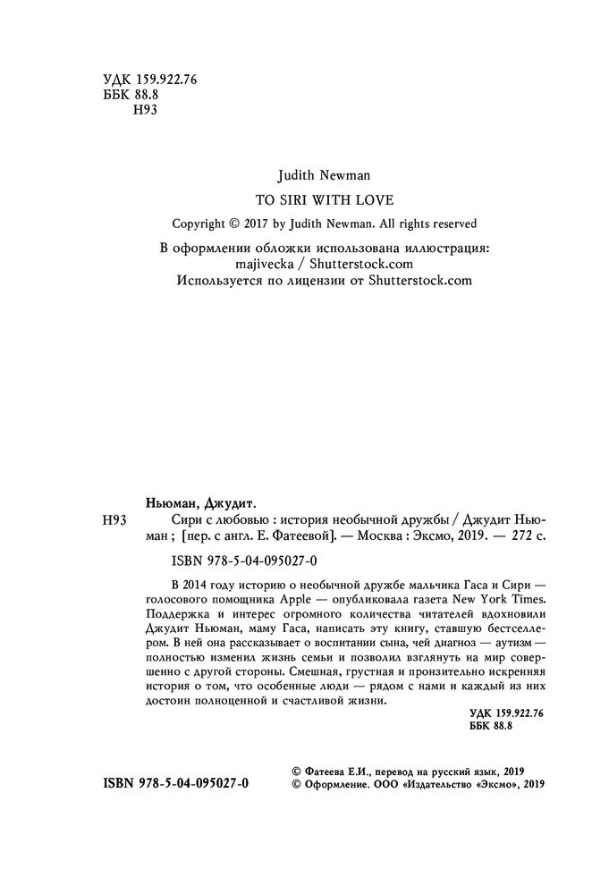 Сири с любовью. История необычной дружбыВ данный момент этот товар отсутствует в продаже. Возможно, у нас найдется аналогичный или похожий товар здесь. Серия: Героем может быть любой. Книги, которые вселяют надежду В 2014 году историю о необычной дружбе мальчика Гаса и Сири — голосового помощника Apple — опубликовала газете New York Times. Поддержка и интерес огромного количества читателей вдохновили Джудит Ньюман, маму Гаса, написать эту книгу, ставшую бестселлером. В ней она рассказывает о воспитании сына, чей диагноз — аутизм — полностью изменил жизнь семьи и позволил взглянуть на мир совершенно с другой стороны. Смешная, грустная и пронзительно искренняя история о том, что особенные люди — рядом с нами, и каждый из них достоин полноценной и счастливой жизни. |