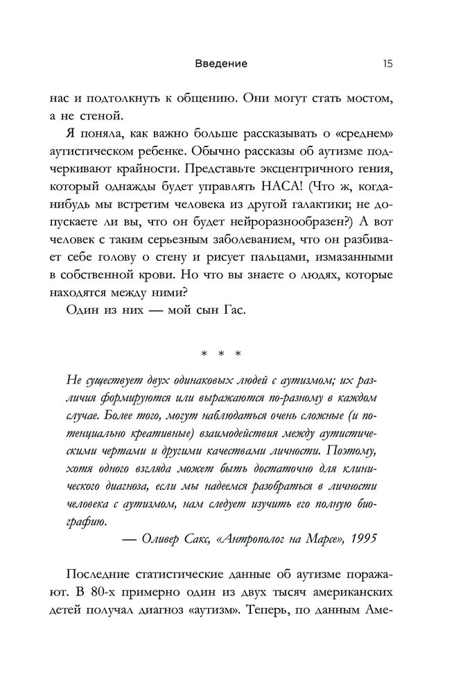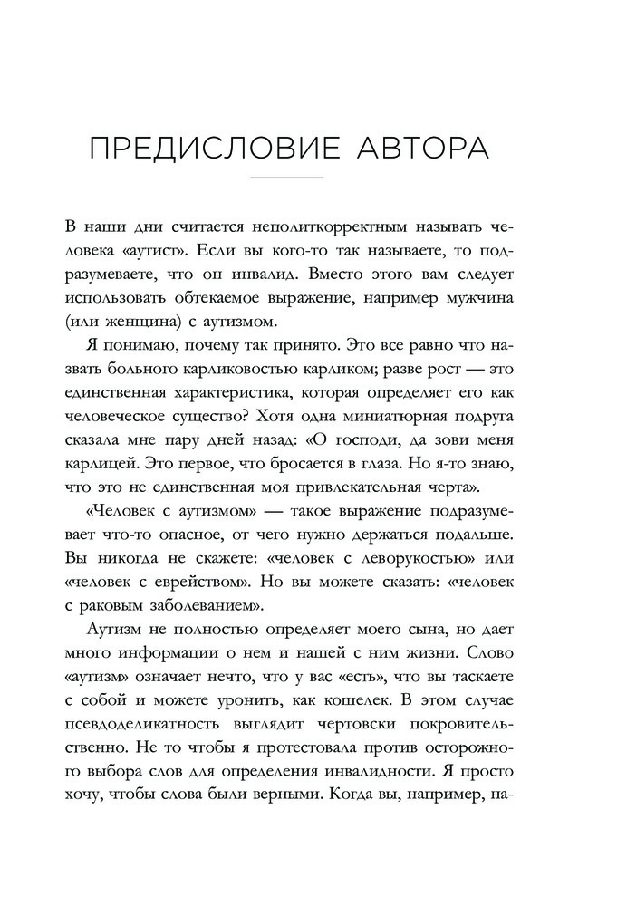 Нормальность не цель и не должна быть целью. Книга вводит нас в понимание, что люди с аутизмом – это такие же люди, как и мы все. Даже если вы не страдаете этим заболеванием, по крайней мере, следует уважительно относиться к таким людям, слушать их. Ведь в чем их вина, что они такими родились? Эта трогательная история покорила миллионы людей, надеюсь, она заставила задуматься многих о своем отношении к людям с ограниченными возможностями. Как можно осуждать других родителей, как они смогли родить «такое создание»? Их нужно понимать. Помогать. Сопереживать. А если не дай бог с вашим ребенком произойдет что-то такое же подобное… Что вы тогда скажите, когда от вас все отвернуться и будут показывать пальцем на вашего ребенка и смеяться!? Я думаю, что этот рассказ заставляет задуматься многих и переосмыслить некоторые серьезные вещи в нашей жизни…
