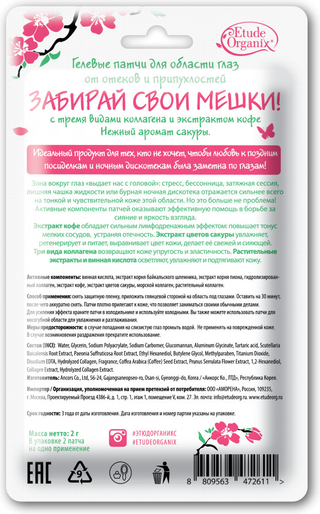 Etude Organix Патчи гелевые для области глаз от отеков и припухлостей