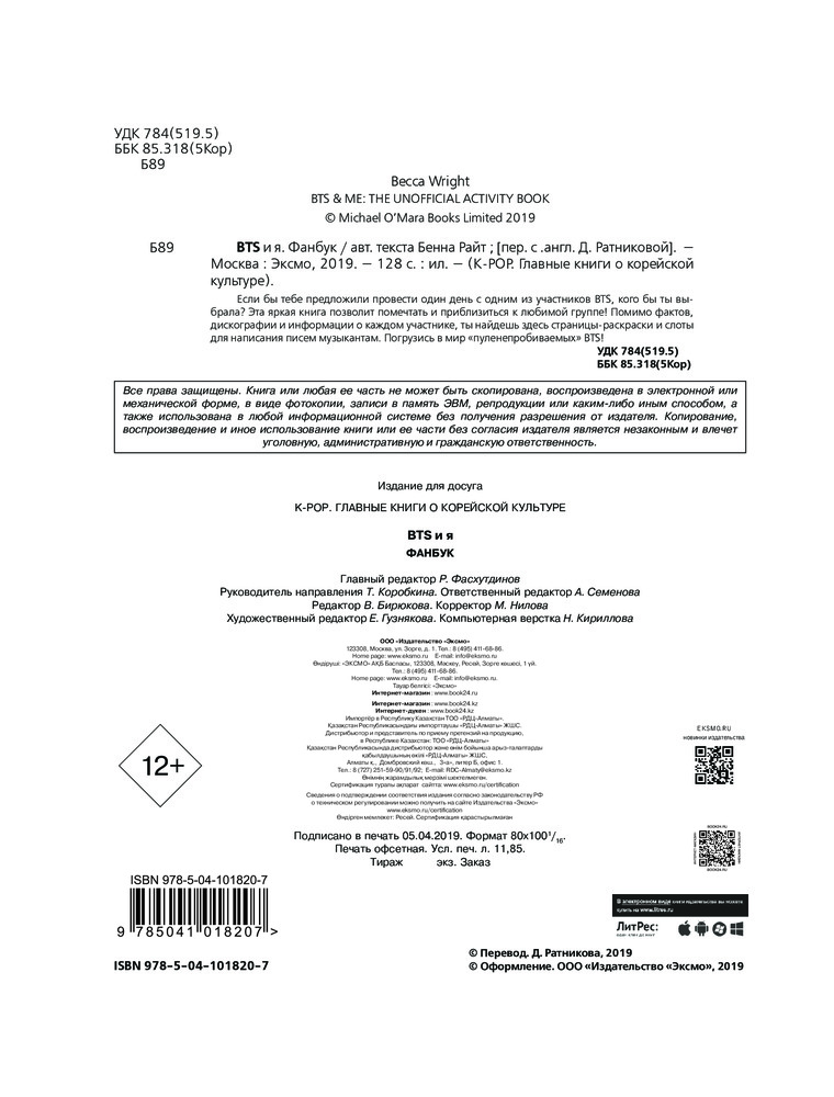 💳 Оплатить за товар можно при получении 🇰🇿 Есть бесплатная доставка по Казахстану от 1 дня 🎁 Копите бонусы с каждой покупки Серия: K-POP. Главные книги о корейской культуре Если бы тебе предложили провести один день с одним из участников BTS, кого бы ты выбрала? Эта яркая книга позволит помечтать и приблизиться к любимой группе! Помимо фактов, дискографии и информации о каждом участнике, ты найдешь здесь страницы — раскраски и слоты для написания писем музыкантам. Погрузись в мир «пуленепробиваемых» BTS! |