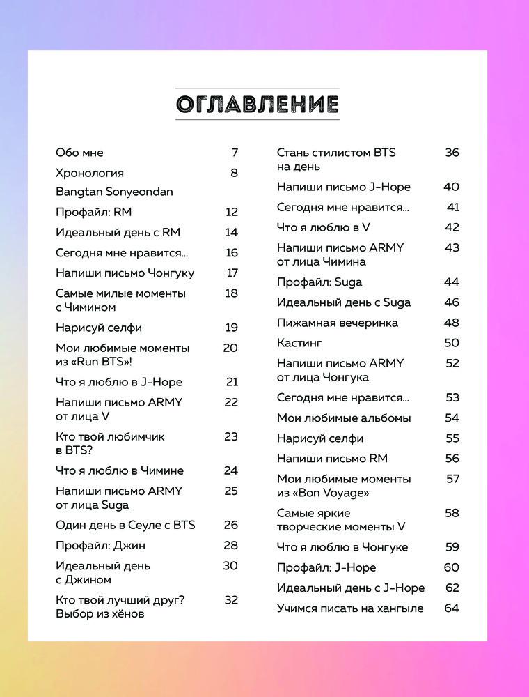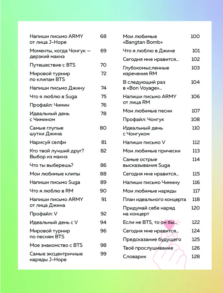 Замечательный подарок для ARMY! Можно порисовать, помечтать, написать письмо любимому мемберу, узнать кое-что о его привычках. Хорошая полиграфия, красивые рисунки, качество на высоте. Оценка 5+!