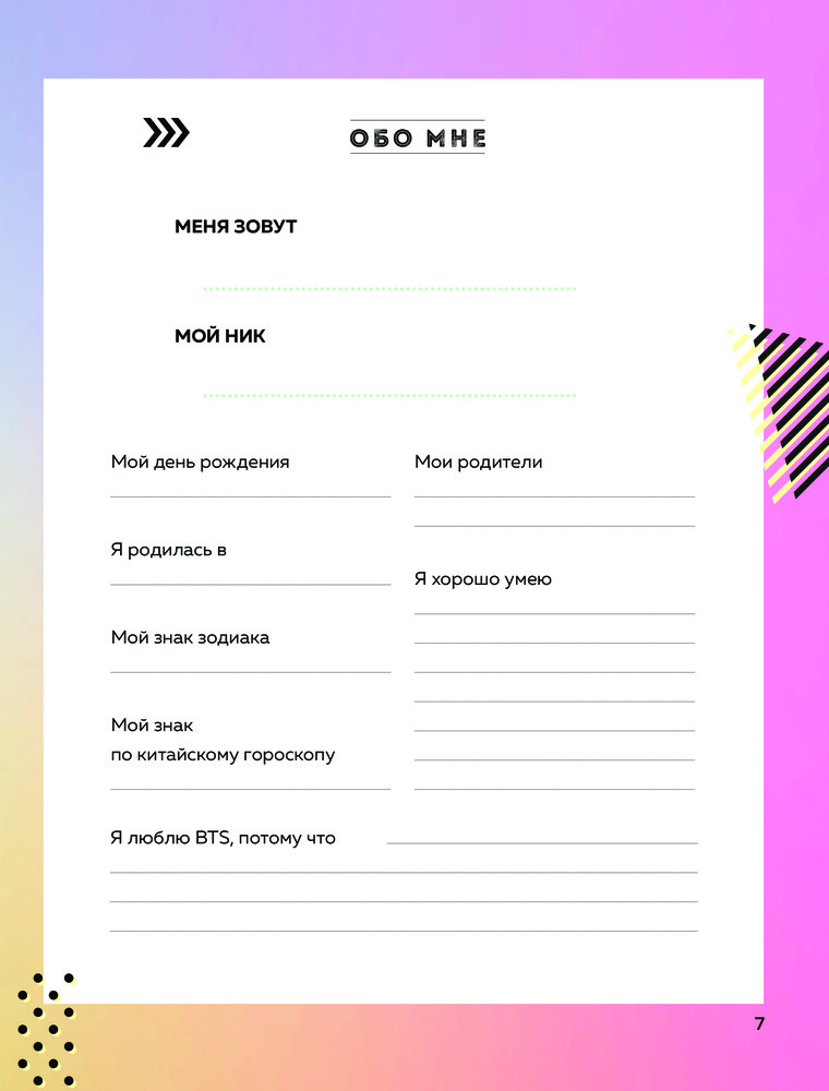 Дочь довольная. Сам фанбук напомнил мне анкеты из моего детства, только мы сами писали и рисовали. А здесь все готово и красиво, только смотри, читай задания и пиши)))