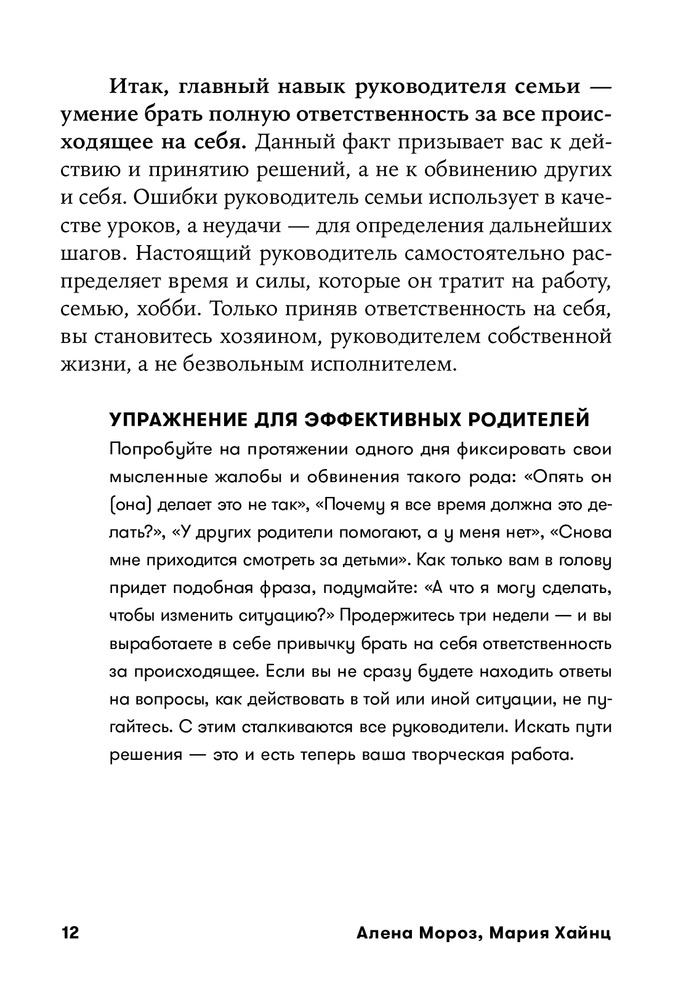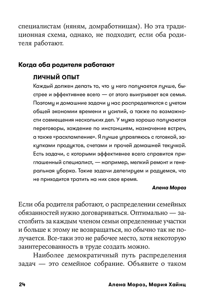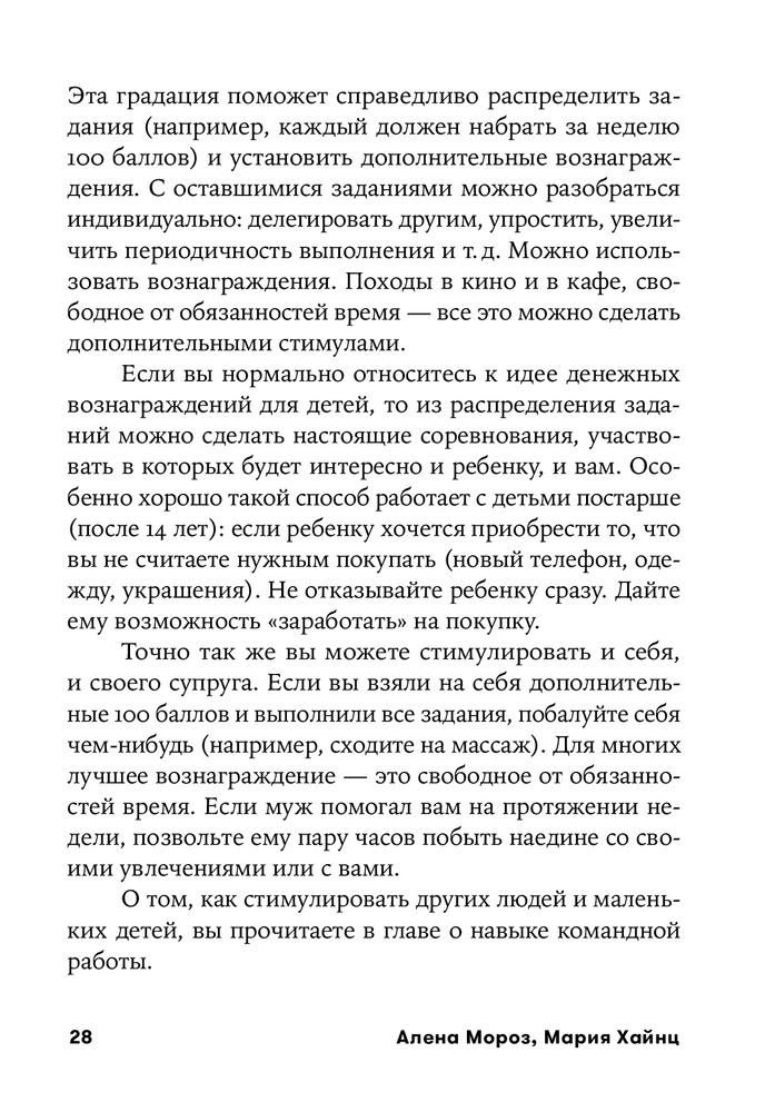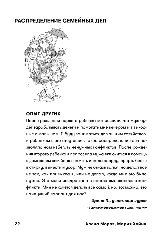 Создаётся ощущение, как в анекдоте про консалтинг: с умным видом объясняют тебе твои же компетенции, словно ты сам недалекий эксперт, при этом их методы далеки от реальности. Но есть и масса полезного, особенно если ранее не углублялись в литературу про тайм-менеджмент. В этом плане мало воды, что плюс. Из минусов, например, в качестве решения проблемы распределения задач по быту - муж работает и думает о финансах, жена одна за всем следит, все прекрасно делегировано и все счастливы. Надо же, как мудро. Отношение к мужу не очень сильно отличается от отношения к детям именно в контексте делигирования быта. Мама все решает, она же все планы составляет и пишет на магнитной доске, в которой делает нужные пометки и напоминания для мужа (словно он просто ещё один подросток в довесок, а не полноправный ответственный родитель). В качестве мотивации детей предлагают призы-поощрения (даже деньги) за выполнения заданий, за что другие психологи из умных книжек по воспитанию накинуться на вас тапками. И некоторые советы от капитанов очевидностей лишь умиляют. Сложно укладывать ребёнка ночью? А просто уберите дневной сон и будет вам счастье. Вы, наверное, об этом сами не подумали без их совета. И не важно, что ребёнок после 6 будет капризный и ужасный, или что он ходит в садик со своим режимом, в книге это решает проблему конкретного примера и все счастливы, вам же предлагают этим примером «взглянуть на свои проблемы иначе». Но все же плюсов четыре - есть интеллектуальные карты - это просто ведь мастхэв в книгах для родителей, все темы разбиты четко по структурам и довольно мало пустословия, есть и про Управление энергией, Управление временем, планирование - удобно что все в одном флаконе и кратко обо всем (со множеством ссылок на собственный блог, естественно).