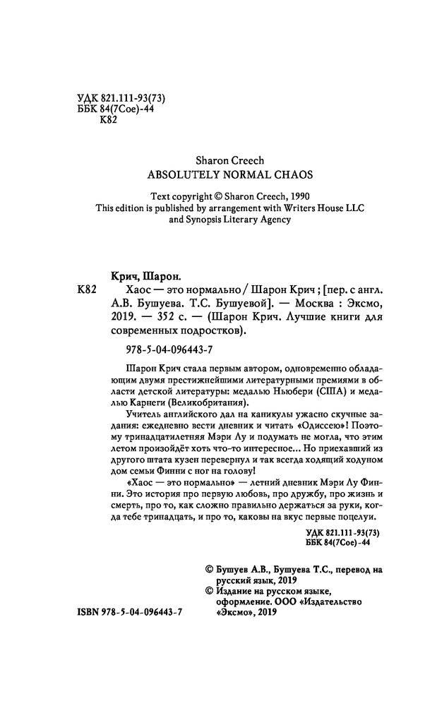 Хаос — это нормальноВ данный момент этот товар отсутствует в продаже. Возможно, у нас найдется аналогичный или похожий товар здесь. Серия: Детская. Шарон Крич. Лучшие книги для современных подростков Шарон Крич стала первым автором, одновременно обладающим двумя престижнейшими литературными премиям в области детской литературы: медалью Ньюбери (США) и медалью Карнеги (Великобритания). Учитель английского дал на каникулы ужасно скучные задания: ежедневно вести дневник и читать «Одиссею»! Поэтому 13-летняя Мэри Лу и подумать не могла, что этим летом произойдёт хоть что-то интересное... Но приехавший из другого штата кузен перевернул и так всегда ходящий ходуном дом семьи Финни с ног на голову! «Хаос — это нормально» — летний дневник Мэри Лу Финни. Это история про первую любовь, про дружбу, про жизнь и смерть, про то, как сложно правильно держаться за руки, когда тебе тринадцать, и про то, каковы на вкус первые поцелуи. |