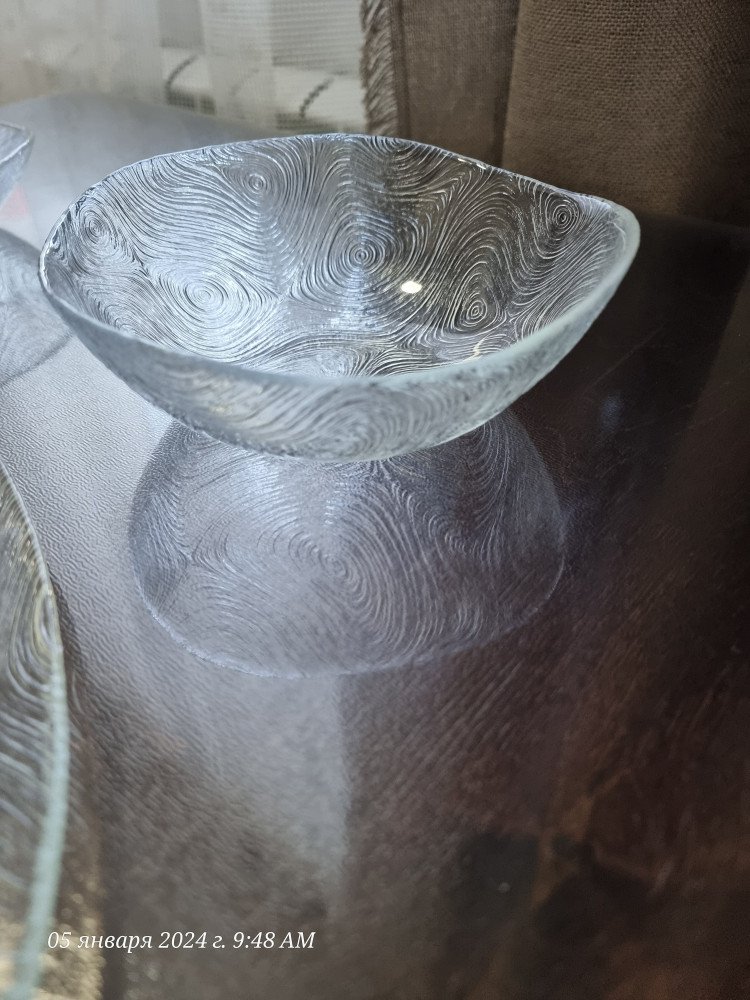 Посуда из этой серии просто нереально красивая! Все эти завитки лично для меня осязаемое воплощение картины Ван Гога "Звёздная ночь")))) А сама тарелочка с ее волнистой формой и прозрачностью - ну один в один как те льдинки в лужах, когда по ночам начинает подмораживать! Очень красиво и необычно, даже мой сын, абсолютно равнодушный к таким вещам прямо с восхищением стал рассматривать)) Взяла сразу несколько размеров и видов, очень рекомендую любителям красивой и нестандартной сервировки!