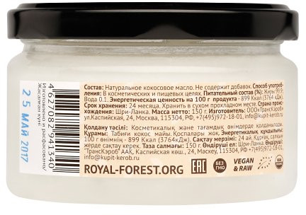 Royal Forest Масло натуральное кокосовоеВ данный момент этот товар отсутствует в продаже. Возможно, у нас найдется аналогичный или похожий товар здесь. Кокосовое масло — это настоящий кладезь красоты и здоровья! Оно используется в косметике или при приготовлении пищи. 100% натуральное Кокосовое масло считается одним из древнейших лекарственных средств из растительного сырья в мире. В процессе выращивания пальм и последующей обработки кокосовых орехов не используются никакие химические вещества. Еще много веков назад практикующим врачам Аюрведы было известно о пользе кокосового масла для здоровья человека. Натуральное кокосовое масло не нуждается в консервантах и обладает уникальным антиоксидантным действием.Используется также в мыловаренной промышленности для приготовления натуральных аюрведических мыл в качестве пенообразующего и очищающего вещества. Является прекрасной нежной основой для натуральных кремов, губных помад, средств по уходу за волосами, массажных масел. |