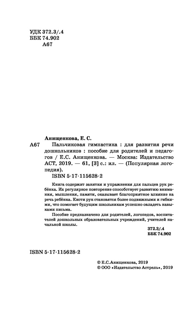 Пальчиковая гимнастикаВ данный момент этот товар отсутствует в продаже. Возможно, у нас найдется аналогичный или похожий товар здесь. Серия: Популярная логопедия Книга содержит занятия и упражнения для пальцев рук ребёнка. Их регулярное повторение способствует развитию внимания, мышления, памяти, оказывает благоприятное влияние на речь ребёнка. Кисти рук становятся более подвижными и гибкими, что помогает будущим школьникам успешно овладеть навыками письма. Пособие предназначено для родителей, логопедов, воспитателей дошкольных образовательных учреждений, учителей начальной школы. |