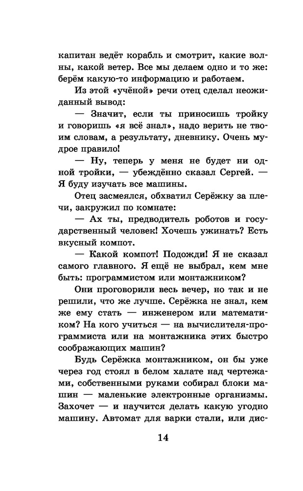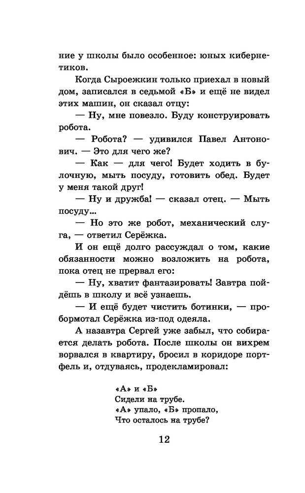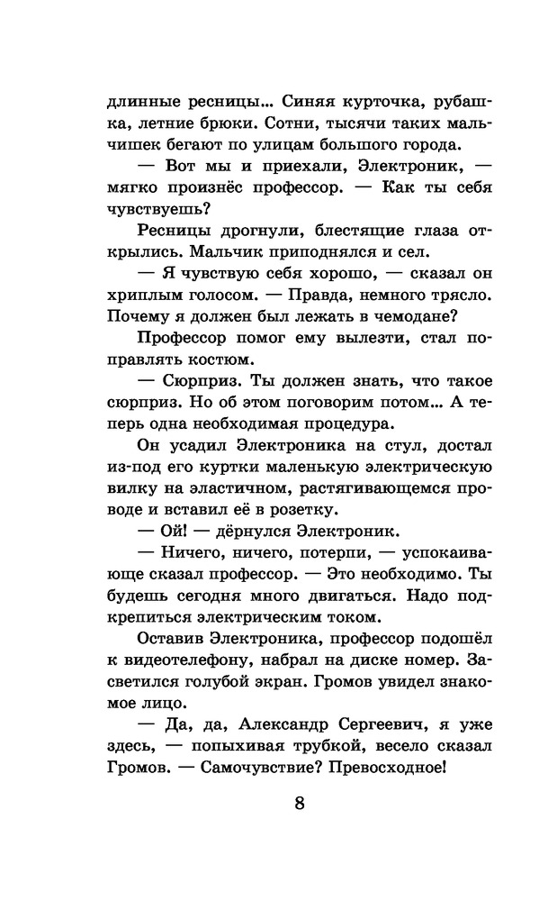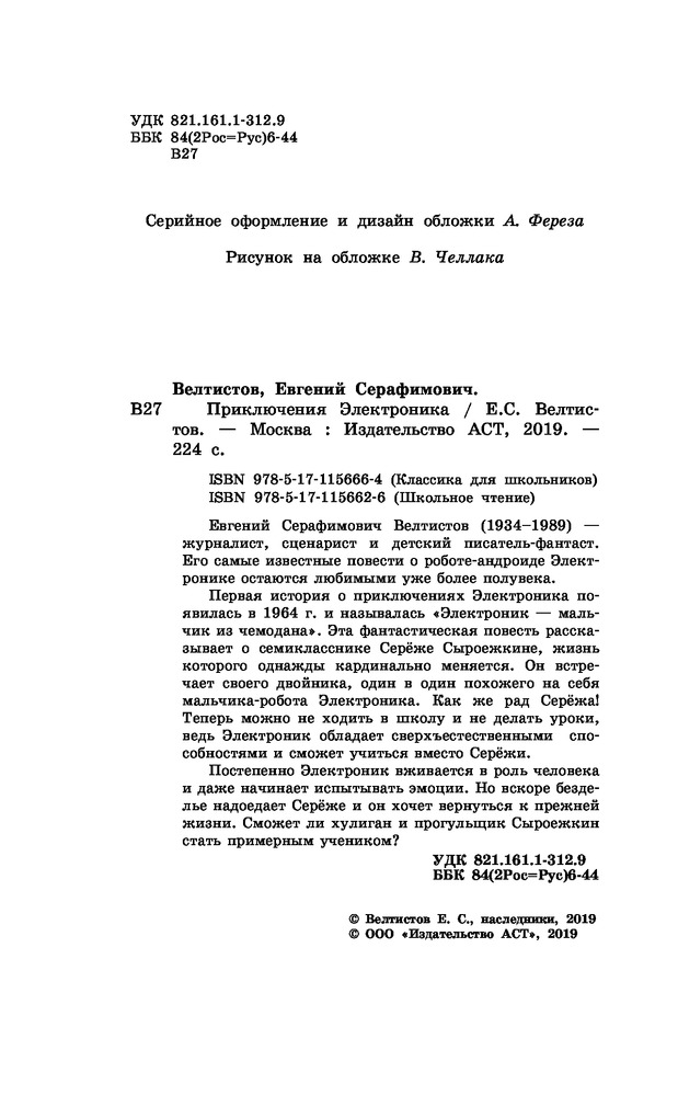 💳 Оплатить за товар можно при получении 🇰🇿 Есть бесплатная доставка по Казахстану 🎁 Копите бонусы с каждой покупки Серия: Классика для школьников Евгений Серафимович Велтистов (1934–1989) — журналист, сценарист и детский писатель-фантаст. Его самые известные повести о роботе-андроиде Электронике остаются любимыми уже более полувека. Первая история о приключениях Электроника появилась в 1964 г. и называлась «Электроник — мальчик из чемодана». Эта фантастическая повесть рассказывает о семикласснике Серёже Сыроежкине, жизнь которого однажды кардинально меняется. Он встречает своего двойника, один в один похожего на себя мальчика-робота Электроника. Как же рад Серёжа! Теперь можно не ходить в школу и не делать уроки, ведь Электроник обладает сверхъестественными способностями и сможет учиться вместо Серёжи. Постепенно Электроник вживается в роль человека и даже начинает испытывать эмоции. Но вкоре безделье надоедает Серёже и он хочет вернуться к прежней жизни. Сможет ли хулиган и прогульщик Сыроежкин стать примерным учеником? |