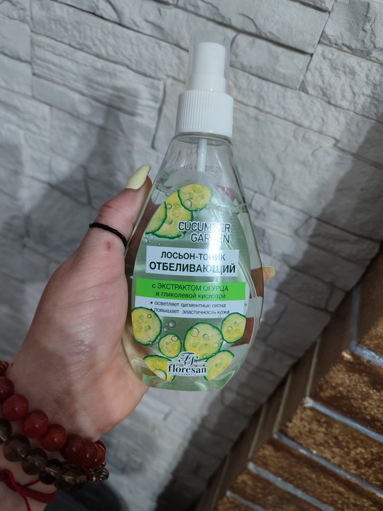 Прекрасный тоник, у меня очень проблемная кожа, чувствительная, уже много лет не могу подобрать крем, какие только не покупала, в летнее время не могу пользоваться кремами, так как лицо не дышит, и сейчас когда лицо загорело кожа очень сильно шелушится, соответственно смотрится это не очень красиво. Так вот этот самый тоник справляется вместо крема на ура, у него очень приятная отдушка, огурчиками, он увлажняет лицо мне и сглаживает шелушение, то есть после тоника не видно шелушение совсем,кожа дышит,не потеет,все прекрасно. Отбеливающего эффекта ПОКА не обнаружила, так как слишком мало времени пользуюсь.