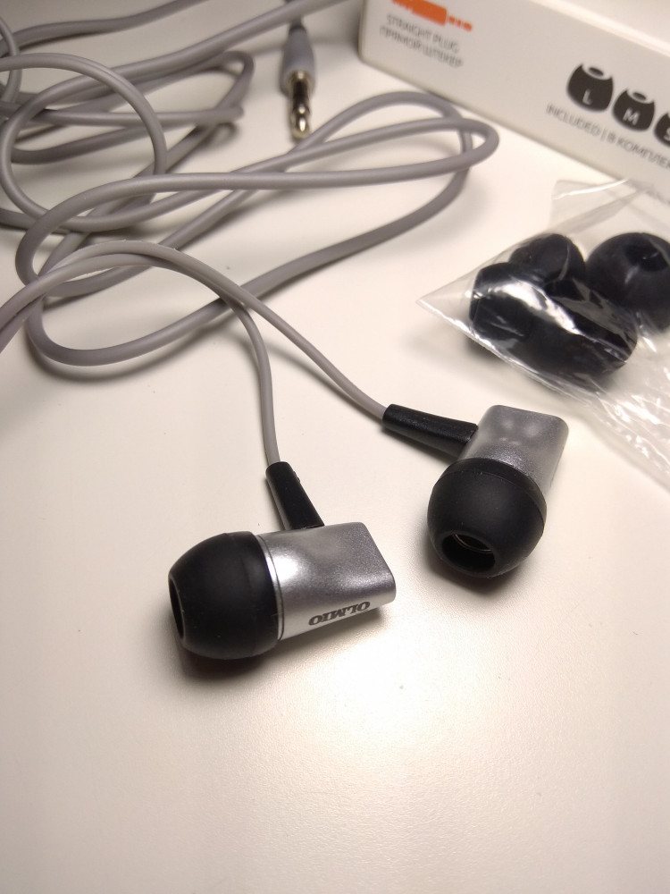 Неплохие внутриканальные наушники. В комплекте две пары сменных амбушюр, упаковано в коробку. Звук хороший.