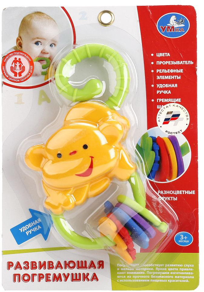 УМка Погремушка «Обезьянка»В данный момент этот товар отсутствует в продаже. Возможно, у нас найдется аналогичный или похожий товар здесь. Развивающая погремушка-прорезыватель «Обезьянка» развлечет ребенка и поможет развить цветовосприятие Она представлена в виде обезьянки с длинным хвостиком и гремящими элементами в виде различных фруктов. |