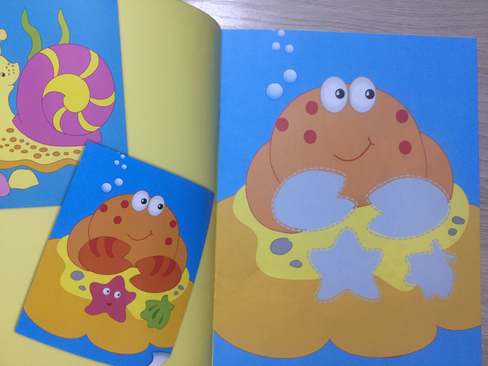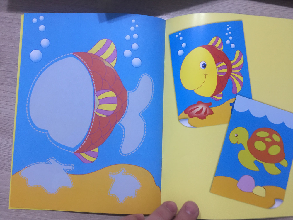 во- первых цена дорогая 362 тенге, во-вторых 2 картинки на которых клеются аппликации на ОДНОМ листе (на обороте), то есть сначала делаете рыбку -переворачиваете делаете черепаху, когда клеишь на стену то думаешь приклеить это или то. За такую цену можно было каждую аппликацию на отдельных листах делать. Больше не возьму.