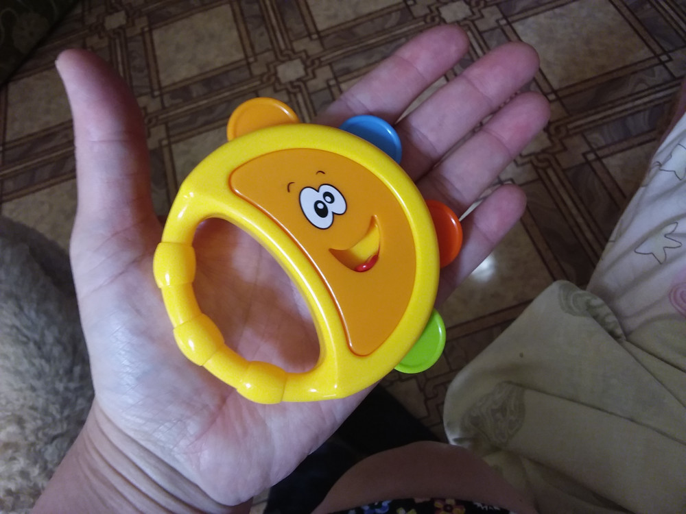 Очень понравилась погремушка. Качество на 5. Гладкая, не хлипкая, в меру яркая, цвета очень приятные глазу, удобно держать в руке, не громкая и не тихая, без запаха. У месяца язычок двигается вверх - вниз, думаю, это обязательно заинтересует деток постарше, нам пока полтора месяца, хорошо отвлекается погремушкой.