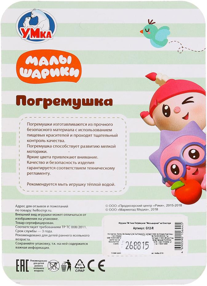 УМка ПогремушкаВ данный момент этот товар отсутствует в продаже. Возможно, у нас найдется аналогичный или похожий товар здесь. Серия: Малышарики Погремушка «Малышарики» с удобной ручкой и изображением забавных персонажей из одноимённого мультика станет любимой игрушкой малюток. За прозрачной частью погремушки прячутся цветные шарики, издающие нежный, мелодичный звук при движении, яркая расцветка игрушки привлечёт внимание малыша, а взять её будет удобно самому маленькому ребёнку. |