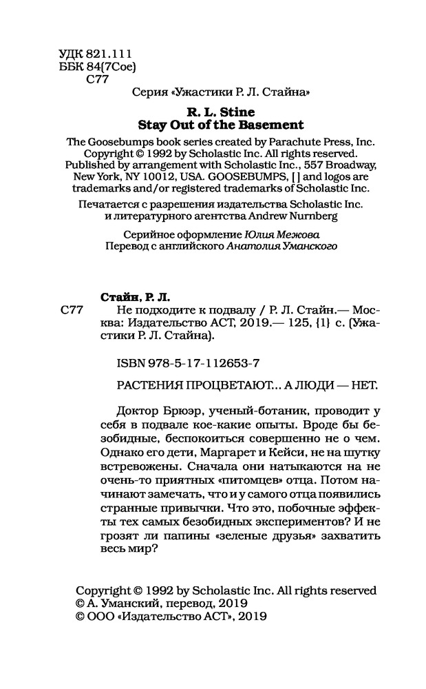 Не подходите к подвалуВ данный момент этот товар отсутствует в продаже. Возможно, у нас найдется аналогичный или похожий товар здесь. Серия: Ужастики Р. Л. Стайна Доктор Брюэр, ученый-ботаник, проводит у себя в подвале кое-какие опыты. Вроде бы безобидные, беспокоиться совершенно не о чем. Однако его дети, Маргарет и Кейси, не на шутку встревожены. Сначала они натыкаются на не очень-то приятных «питомцев» отца. Потом начинают замечать, что и у самого отца появились странные привычки. Что это, побочные эффекты тех самых безобидных экспериментов? И не грозят ли папины «зеленые друзья» захватить весь мир? |
