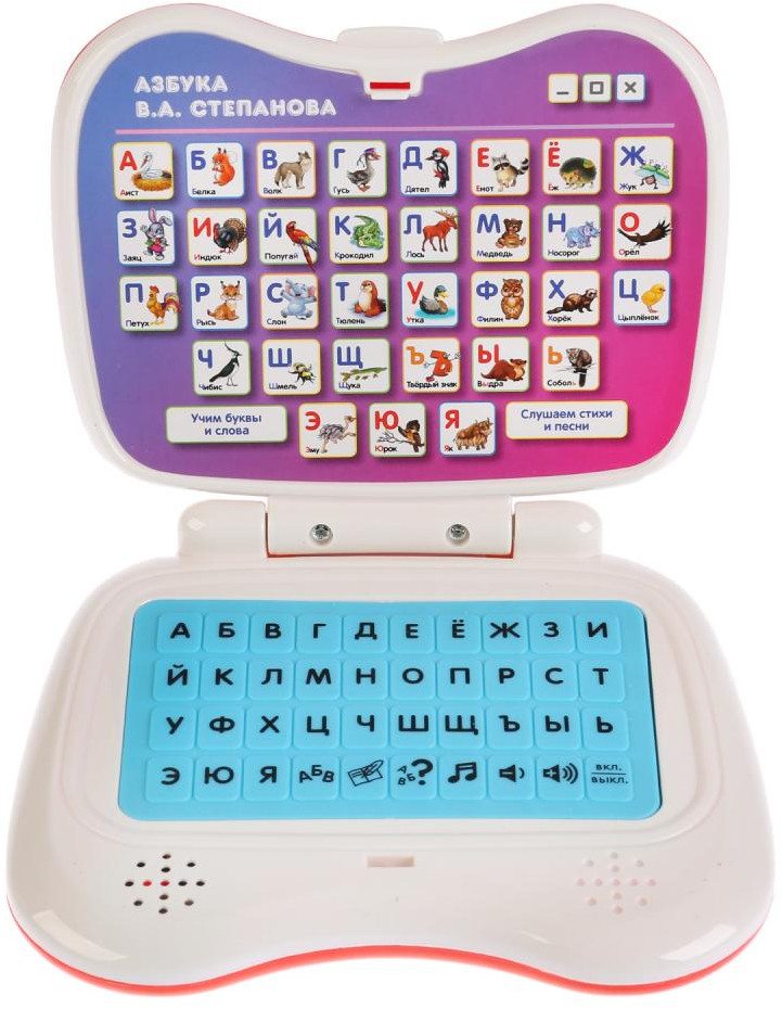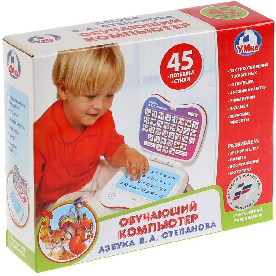 УМка Компьютер обучающий «Азбука В.А. Степанова»В данный момент этот товар отсутствует в продаже. Возможно, у нас найдется аналогичный или похожий товар здесь. Этот компьютер выглядит как настоящий ноутбук, который поможет вашему крохе разобраться с алфавитом, а также выучить несложные стихотворения про животных и проверить полученные знания в режиме экзамена. |