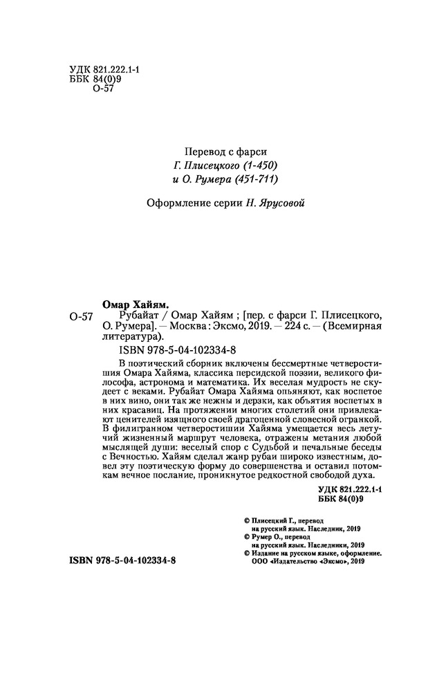 Обязательно нужно сказать о серии " Всемирная литература" . Великолепное издание как по содержанию так и по цене. По силам пенсионерам. Удивительный охват произведений. А Рубайат Омара Хайяма в переводе Г. Плисецкого и О. Румера самый лучший !Благодарю весь коллектив Flip за выбор хороших книг и оперативность доставки.