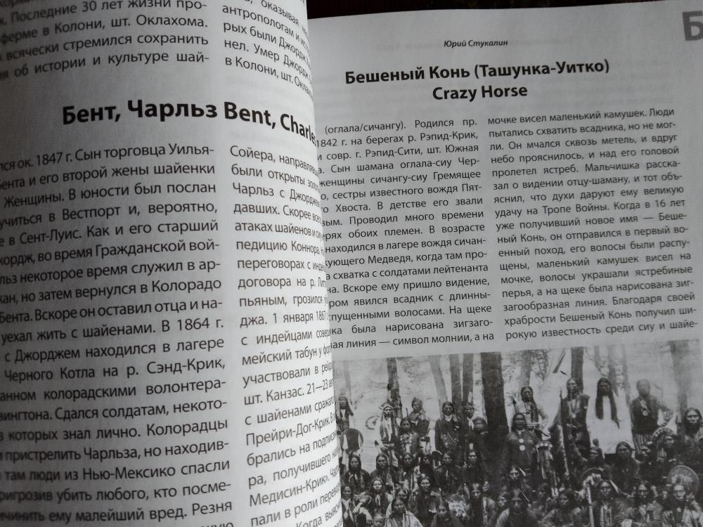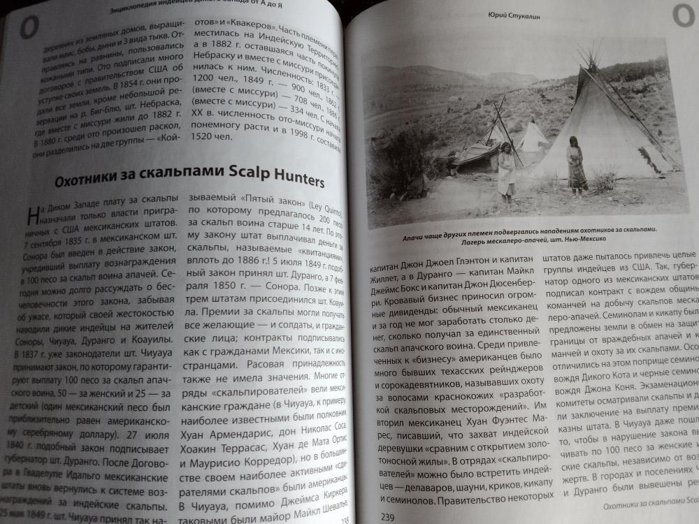 Информация представлена в алфавитном порядке. Наиболее известные сражения, племена, вожди, знаменитые воины-индейцы. Очень много чёрно-белых фото, почти на каждой странице. В середине книги имеется вставка с цветными фото и картинами. Шрифт не мелкий. Но всё же мне здесь не хватает именно истории индейцев, их расселения, быта и традиций. Без этого книга больше напоминает справочник. Вообще у этого автора было несколько интересных книг - и про индейских шаманов, и про стрелков Дикого Запада, и про войны индейцев и тактику. Жаль, что не переиздаются. Было и более раннее издание Энциклопедии индейцев, больше на 200 страниц. А в этом новом издании выборка, всё в общем, не углубленно.