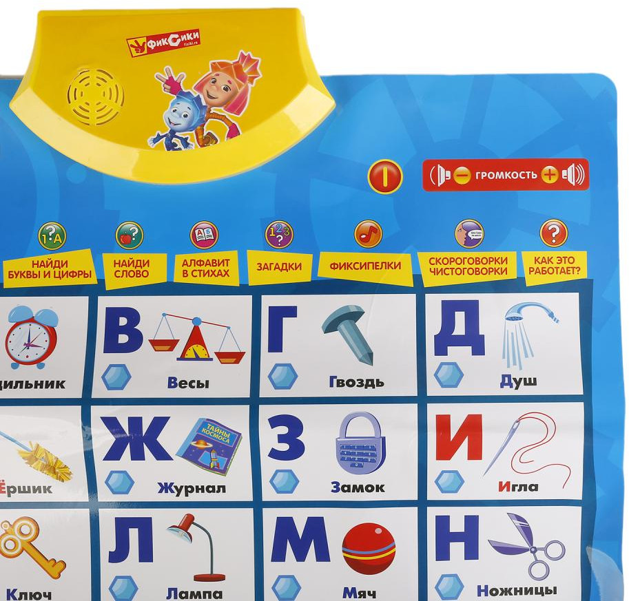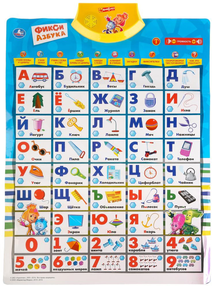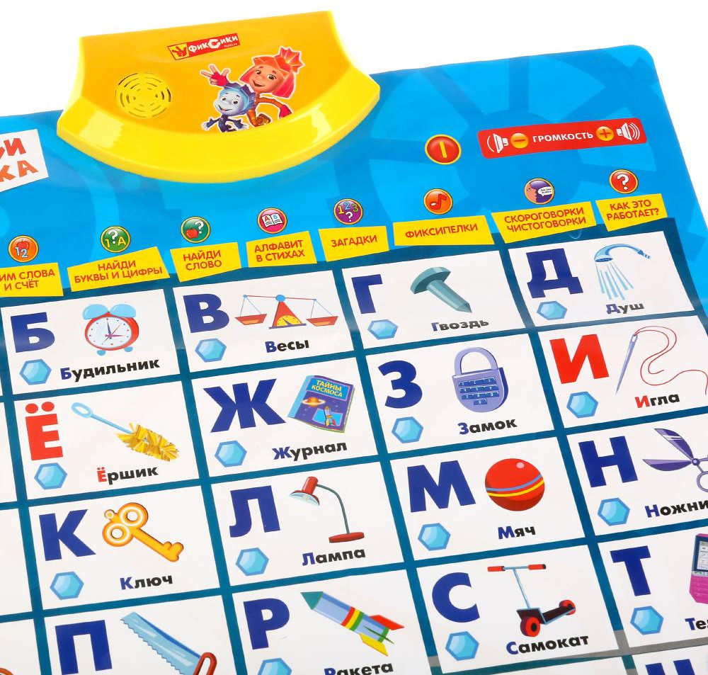 УМка Плакат обучающий «Фикси азбука»В данный момент этот товар отсутствует в продаже. Возможно, у нас найдется аналогичный или похожий товар здесь. Серия: Фиксики Говорящий плакат «Фикси азбука» — это уникальный и многофункциональный помощник малышу. На нём изображены клеточки с буквами и рисунками разных предметов, которые начинаются на эту букву. У плаката есть звуковой модуль с динамиком, кнопки включения и выключения, регулировки громкости. |