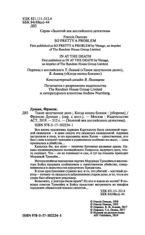 💳 Оплатить за товар можно при получении 🇰🇿 Есть бесплатная доставка по Казахстану 🎁 Копите бонусы с каждой покупки Серия: Золотой век английского детектива Вся жизнь художника Адриана Картхэллоу была сплошной чередой скандалов — и даже смерть его оказалась скандальной. Адриана застрелили в упор, и его красавица жена Хелен — единственная, кто был с ним в момент трагедии в уединенном особняке на скале — сама призналась в убийстве... Казалось бы, все ясно — типично богемная кровавая драма. Однако провинциального полицейского Пенросса, ведущего дело, что-то смущает. Что — он не понимает и сам, и тут на помощь приходит Мордекай Тремейн... Интереснейшая шахматная партия Мордекая Тремейна и инспектора Бойса прервана сообщением о таинственном убийстве, совершившемся в окрестностях курортного Бриджтона. В этом преступлении странно все: и то, что убитый — местный доктор — почему-то оказался в заброшенном старом доме, и то, что в его сумке был обнаружен револьвер. Возможно, у доктора были враги? Но кто и каков их мотив? В поисках ответов Тремейну и Бойсу предстоит вытряхнуть из шкафов городских обывателей немало скелетов... |