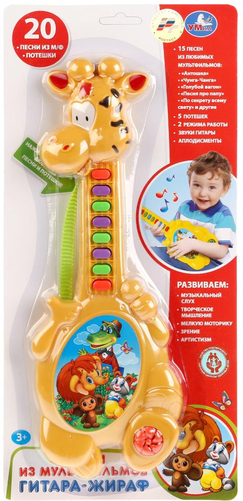 УМка Гитара-жираф «Песни из мультфильмов»В данный момент этот товар отсутствует в продаже. Возможно, у нас найдется аналогичный или похожий товар здесь. Игрушка изготовлена из высококачественной пластмассы жёлтого цвета в виде сказочного жирафа с клавишами на шее-грифе и иллюстрациями персонажей знаменитых русских мультфильмов. Воспроизводит 5 потешек, звуки гитары, аплодисменты и 15 песен из любимых мультиков. Озвучено профессиональными актёрами. Выпущено по лицензии «Музыка Шаинского». Развивает музыкальный слух, память, творческое мышление, артистизм и мелкую моторику рук. |