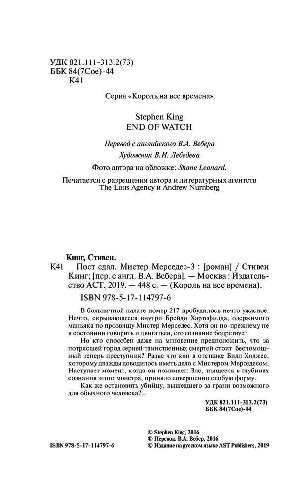 💳 Оплатить за товар можно при получении 🇰🇿 Есть бесплатная доставка по Казахстану от 1 дня 🎁 Копите бонусы с каждой покупки Серия: Король на все времена В больничной палате номер 217 пробудилось нечто ужасное. Нечто, скрывающееся внутри Брейди Хартсфилда, одержимого маньяка по прозвищу Мистер Мерседес. Хотя он по-прежнему не в состоянии говорить и двигаться, его сознание бодрствует. Но кто способен даже на мгновение предположить, что за потрясшей город серией таинственных смертей стоит беспомощный теперь преступник? Разве что коп в отставке Билл Ходжес, которому дважды доводилось иметь дело с Мистером Мерседесом. Наступает момент, когда он понимает: Зло, таящееся в глубинах сознания этого монстра, приняло совершенно особую форму. Как же остановить убийцу, вышедшего за грани возможного для обычного человека?.. |