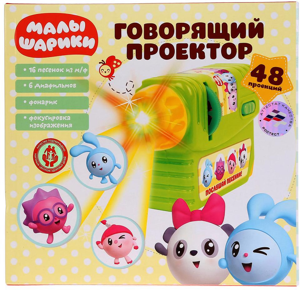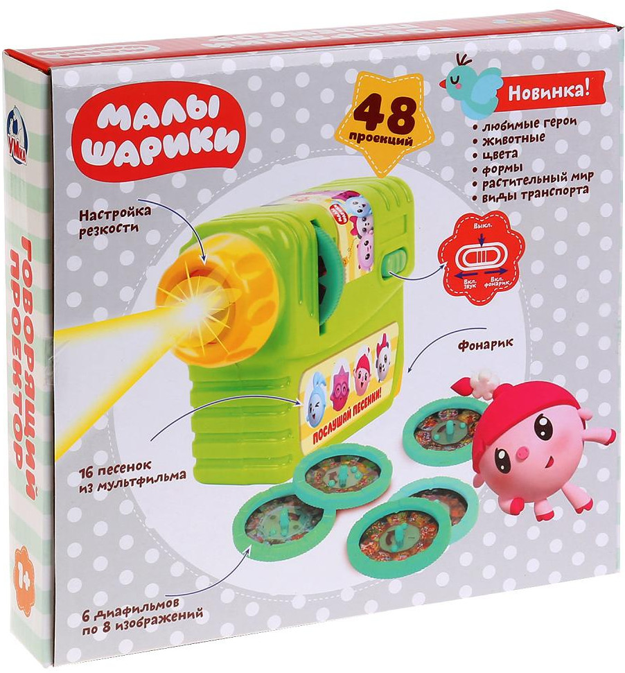 УМка Проектор музыкальный «Малышарики»В данный момент этот товар отсутствует в продаже. Возможно, у нас найдется аналогичный или похожий товар здесь. Серия: Малышарики Развивающие проектор «Малышарики» понравится каждому малышу и подарит массу незабываемых мгновений! С его помощью можно посмотреть 48 кадров с персонажами одноимённого мультфильма, цветами, формами, животным, видами транспорта и другими обучающими картинками. В комплект входят 6 диафильмов. В проектор встроен фонарик. |